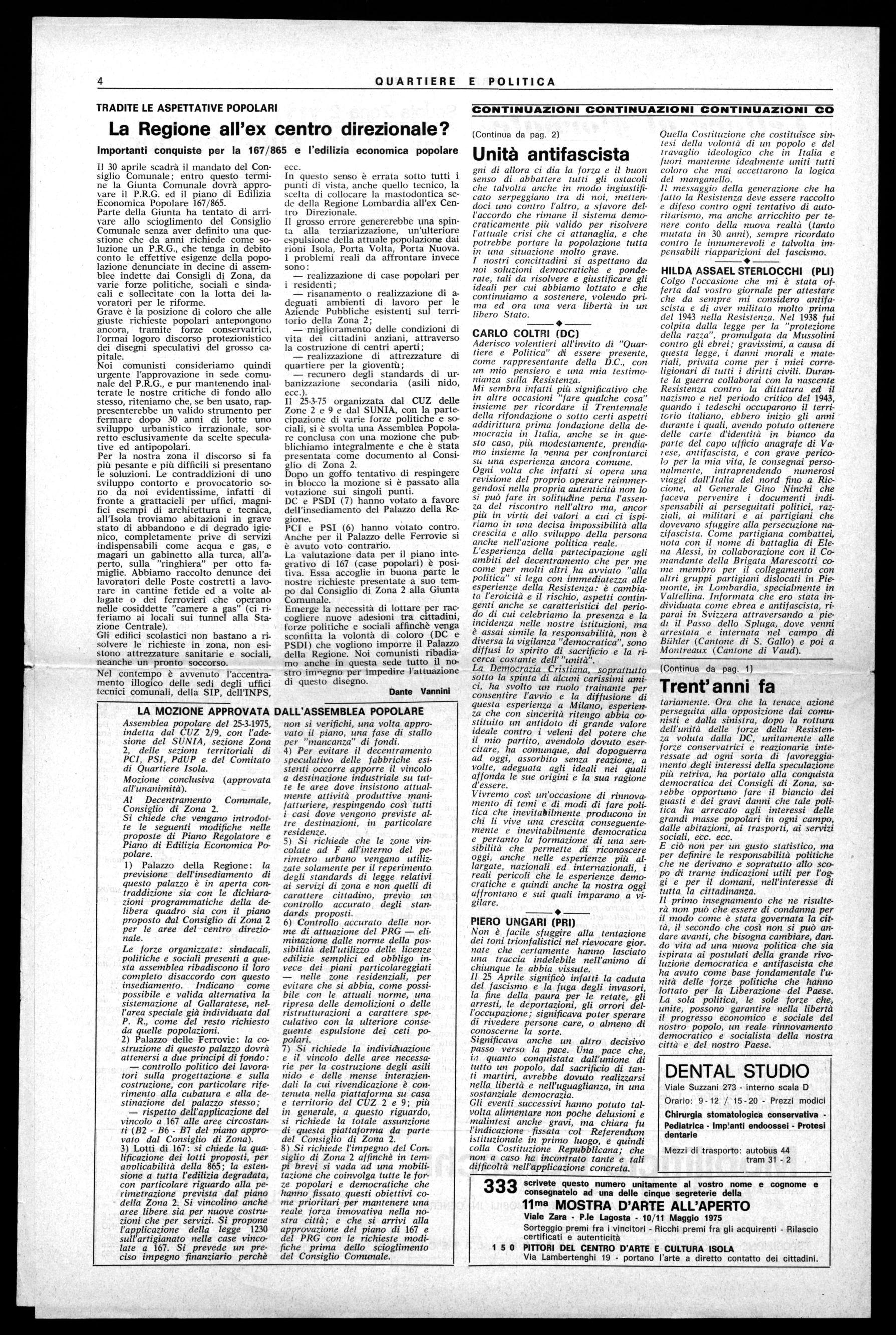 La valutazione data per il piano integrativo di 167 (case popolari) è positiva. Essa accoglie in buona parte le nostre richieste presentate a suo tempo dal Consiglio di Zona 2 alla Giunta Comunale. Emerge la necessità di lottare per raccogliere nuove adesioni tra cittadini, forze politiche e sociali affinchè venga sconfitta la volontà di coloro (DC e PSDI) che vogliono imporre il Palazzo della Regione. Noi comunisti ribadiamo anche in questa sede tutto il nostro imnegno per impedire l'attuazione di questo disegno.