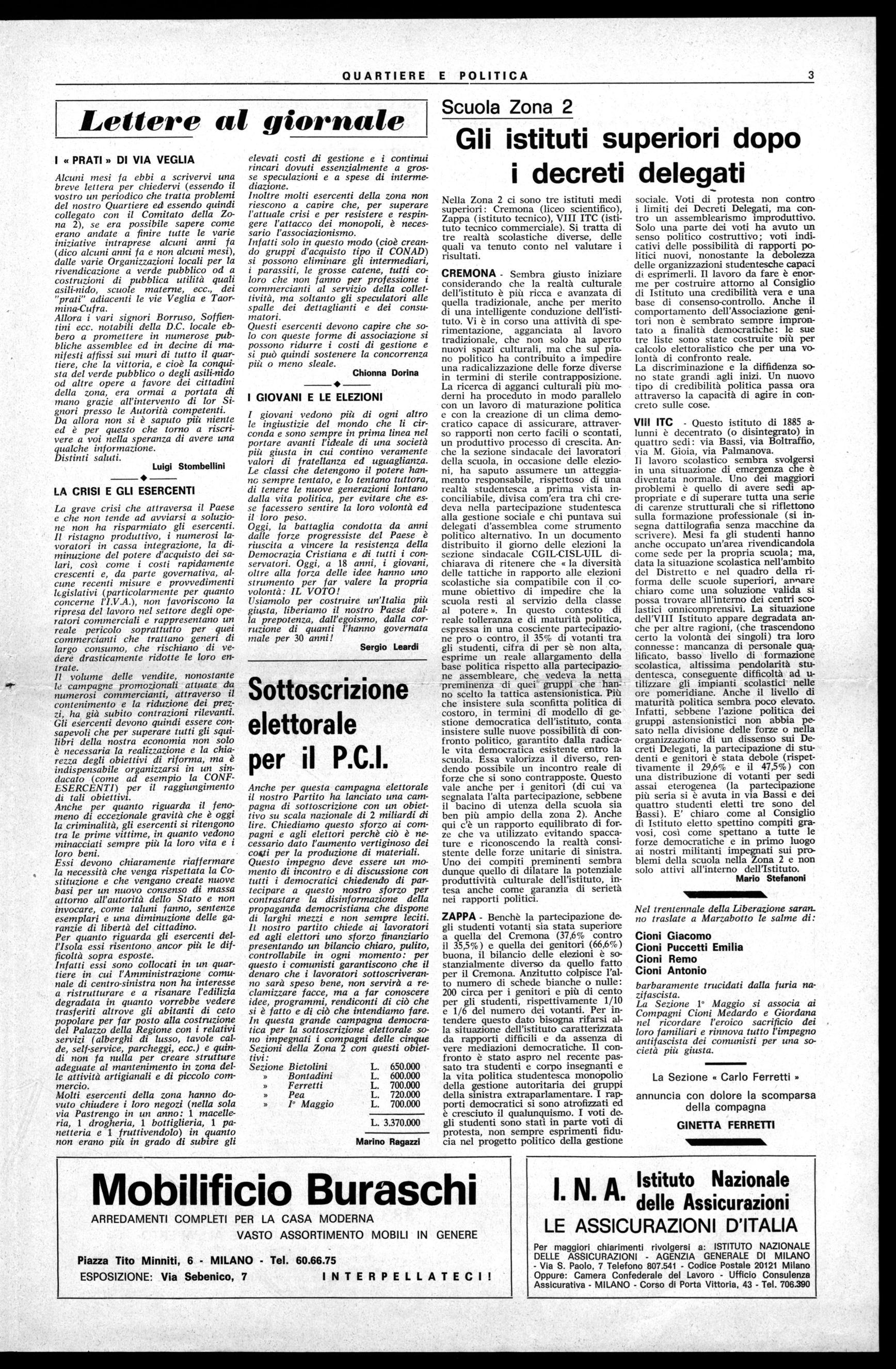 Alcuni mesi fa ebbi a scrivervi una breve lettera per chiedervi (essendo il vostro un periodico che tratta problemi del nostro Quartiere ed essendo quindi collegato con il Comitato della Zona 2), se era possibile sapere come erano andate a finire tutte le varie iniziative intraprese alcuni anni fa (dico alcuni anni fa e non alcuni mesi), dalle varie Organizzazioni locali per la rivendicazione a verde pubblico od a costruzioni di pubblica utilità quali asili-nido, scuole materne, ecc., dei "prati" adiacenti le vie Veglia e Taormina-Cufra.
