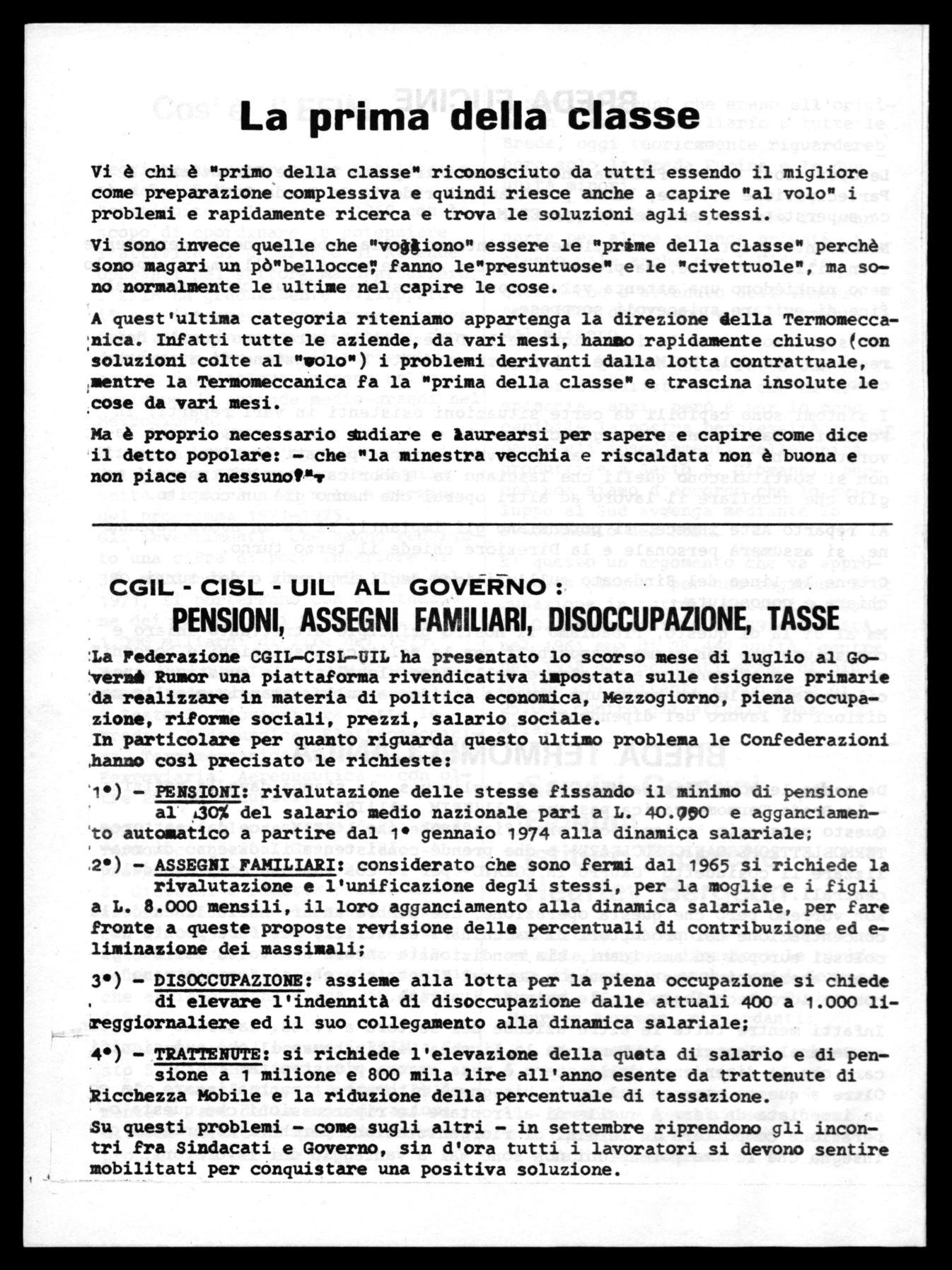 Rispetto alla fine di giugno quando i Consigli di Fabbrica e le assemblee dei lavoratori definirono la piattaforma rivendicativa (applicazione del contratto di lavoro; inquadramento unico, ricontrattazione premio di produzione, monte ore per Consigli di Fabbrica, ecc.), nuovi ed iàportanti fatti si sono verificati: il passaggio dall'EFIM all'IRI della Termomeccanica, un piano di ristrutturazione che investe tutti i settori produttivi alle Facine.