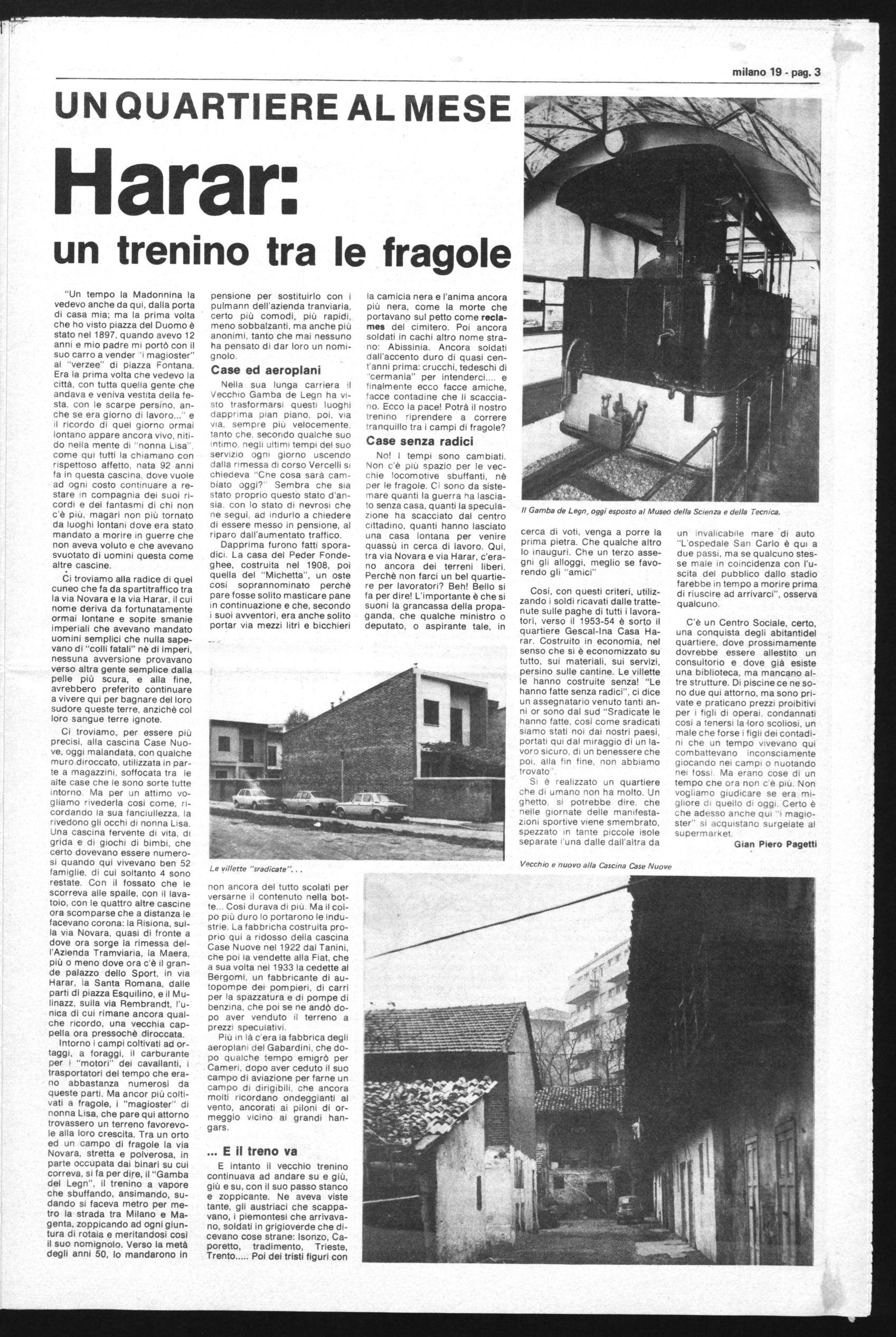 Così, con questi criteri, utilizzando i soldi ricavati dalle trattenute sulle paghe di tutti i lavoratori, verso il 1953-54 è sorto il quartiere Gescal-Ina Casa Harar. Costruito in economia, nel senso che si è economizzato su tutto, sui materiali, sui servizi, persino sulle cantine. Le villette le hanno costruite senza! "Le hanno fatte senza radici". ci dice un assegnatario venuto tanti anni or sono dal sud "Sradicate le hanno fatte, così come sradicati siamo stati noi dai nostri paesi. portati qui dal miraggio di un lavoro sicuro, di un benessere che poi. alla fin fine, non abbiamo trovato'. Si è realizzato un quartiere che di umano non ha molto. Un ghetto si potrebbe dire. che nelle giornate delle manifestazioni sportive viene smembrato, spezzato ;n tante piccole isole separate l'una dalle dall'altra da Vecchio e nuovo alla Cascina Case Nuove