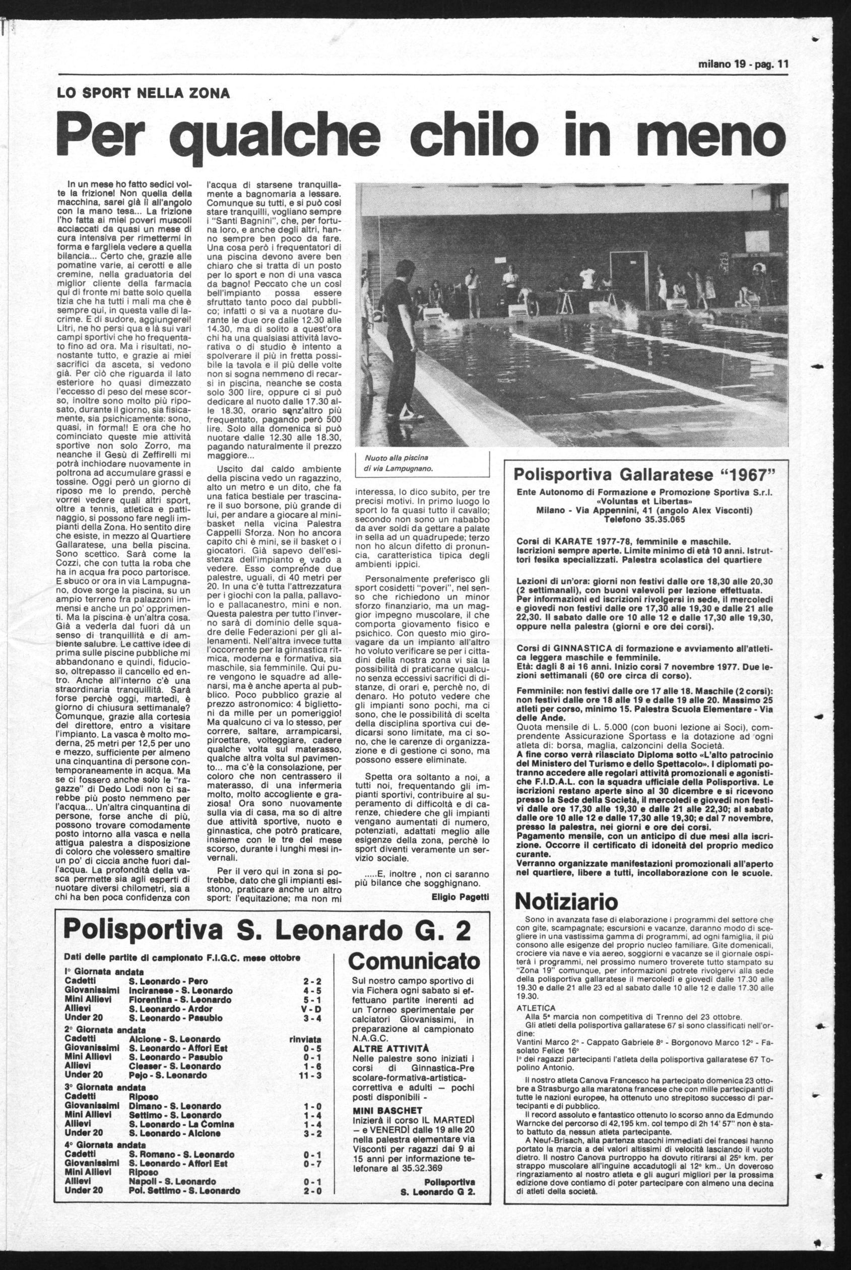 Sono in avanzata fase di elaborazione i programmi del settore che con gite, scampagnate; escursioni e vacanze. daranno modo di scegliere in una vastissima gamma di programmi, ad ogni famiglia, il più consono alle esigenze del proprio nucleo familiare. Gite domenicali. crociere via nave e via aereo, soggiorni e vacanze se il giornale ospiterà i programmi, nel prossimo numero troverete tutto stampato su "Zona 19" comunque, per informazioni potrete rivolgervi alla sede della polisportiva gallaratese il mercoledì e giovedi dalle 17.30 alle 19.30 e dalle 21 alle 23 ed al sabato dalle 10 alle 12 e dalle 17.30 alle 19.30.