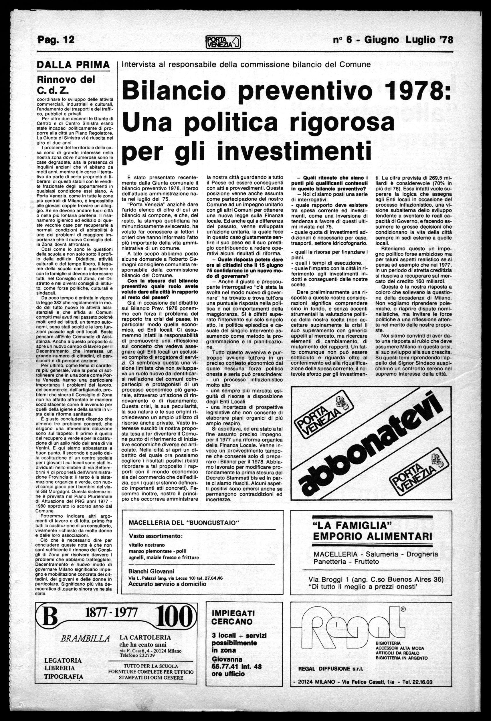 "LA FAMIGLIA" EMPORIO ALIMENTARI MACELLERIA - Salumeria - Drogheria Panetteria - Frutteto Via Broggi 1 (ang. C.so Buenos Aires 36) "Di tutto ii meglio a prezzi onesti' MACELLERIA DEL "BUONGUSTAIO" Vasto assortimento: vitello nostrano manzo piemontese - polli agnelli, maiale fresco e fritture Bianchi Giovanni Via L. Palazzi (ang. via Lecco 10) tel. 27.64.46 Accurato servizio a domicilio B 1877-1977 101:V BRAMBILLA LA CARTOLERIA che ha cento anni via F.Casati, 4 - 20124 Milano Telefono 222729 LEGATORIA LIBRERIA TIPOGRAFIA TUTTO PER LA SCUOLA FORNITURE COMPLETE PER UFFICIO STAMPATI DI OGNI GENERE BIGIOTTERIA ACCESSORI ALTA MODA ARTICOLI DA REGALO BIGIOTTERIA IN ARGENTO REGAL DIFFUSIONE s.r.l. - 20124 MILANO - Via Felice Casati, 1/a - Tel. 22.16.03 Pag. 12 n° 6 - Giugno Luglio '78