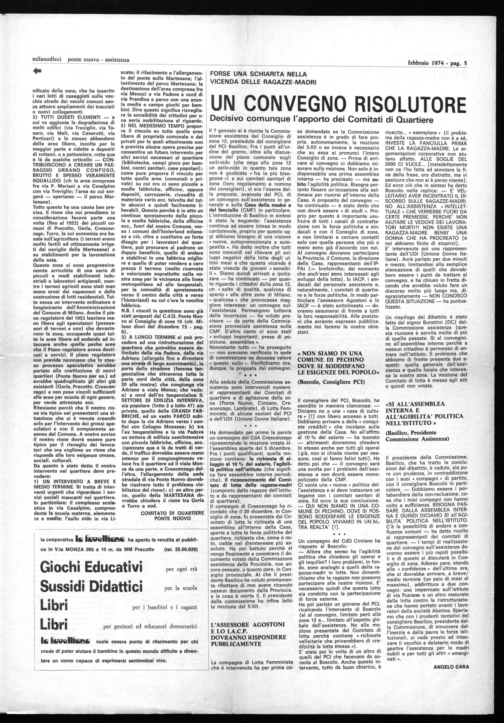 Il Comitato di Gorla aveva invitato anche noi di Ponte Nuovo, insieme ad altri comitati e ad altre forze politiche del rione, a partecipare fattivamente alla buona riuscita della manifestazione: purtroppo, sia a noi che ai compagni del Collettivo Franceschi, l'invito giungeva solo 1'11 gennaio (la vigilia della manifestazione) e ci era impossibile predisporre un intervento che non fosse semplicemente quello della formale adesione all'iniziativa. Speriamo che, nel prossimo avvenire, siccome la lotta per il nido ed il parco sarà ancora lunga, tutti i comitati di quartiere e le altre forze politiche e sociali che operano nel rione, possano costituire un coordinamento organico e coagulare con maggiore facillità attorno alla lotta le masse dei lavoratori, che vedono sempre con simpatia tutti quegli sforzi che vengono portati avanti in modo unitario. C.D.O.P.N.