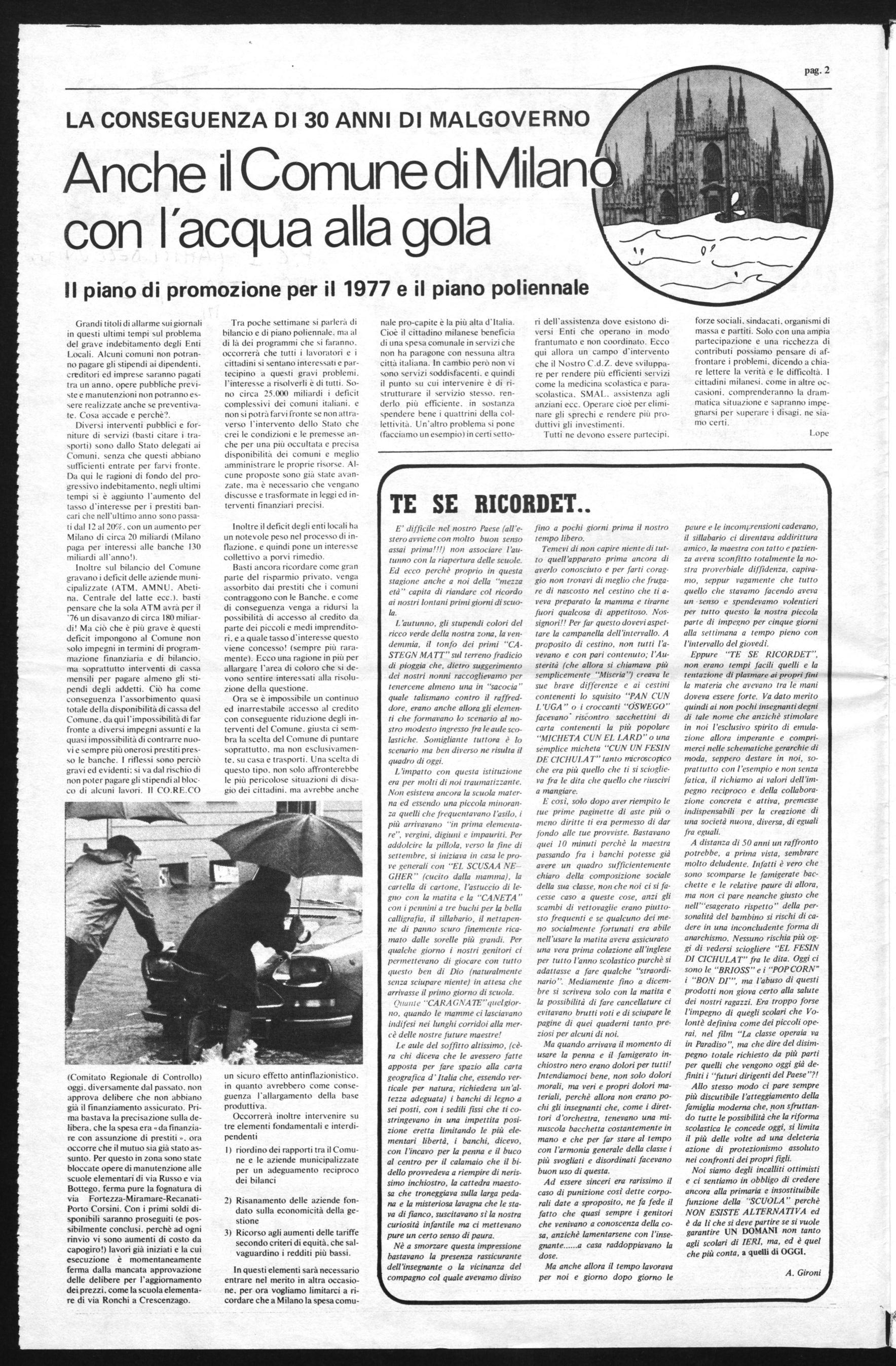 forze sociali, sindacati, organismi di massa e partiti. Solo con una ampia partecipazione e una ricchezza di contributi possiamo pensare di affrontare i problemi, dicendo a chiare lettere la verità e le difficoltà. I cittadini milanesi. come in altre occasioni. comprenderanno la drammatica situazione e sapranno impegnarsi per superare i disagi. ne siamo certi.