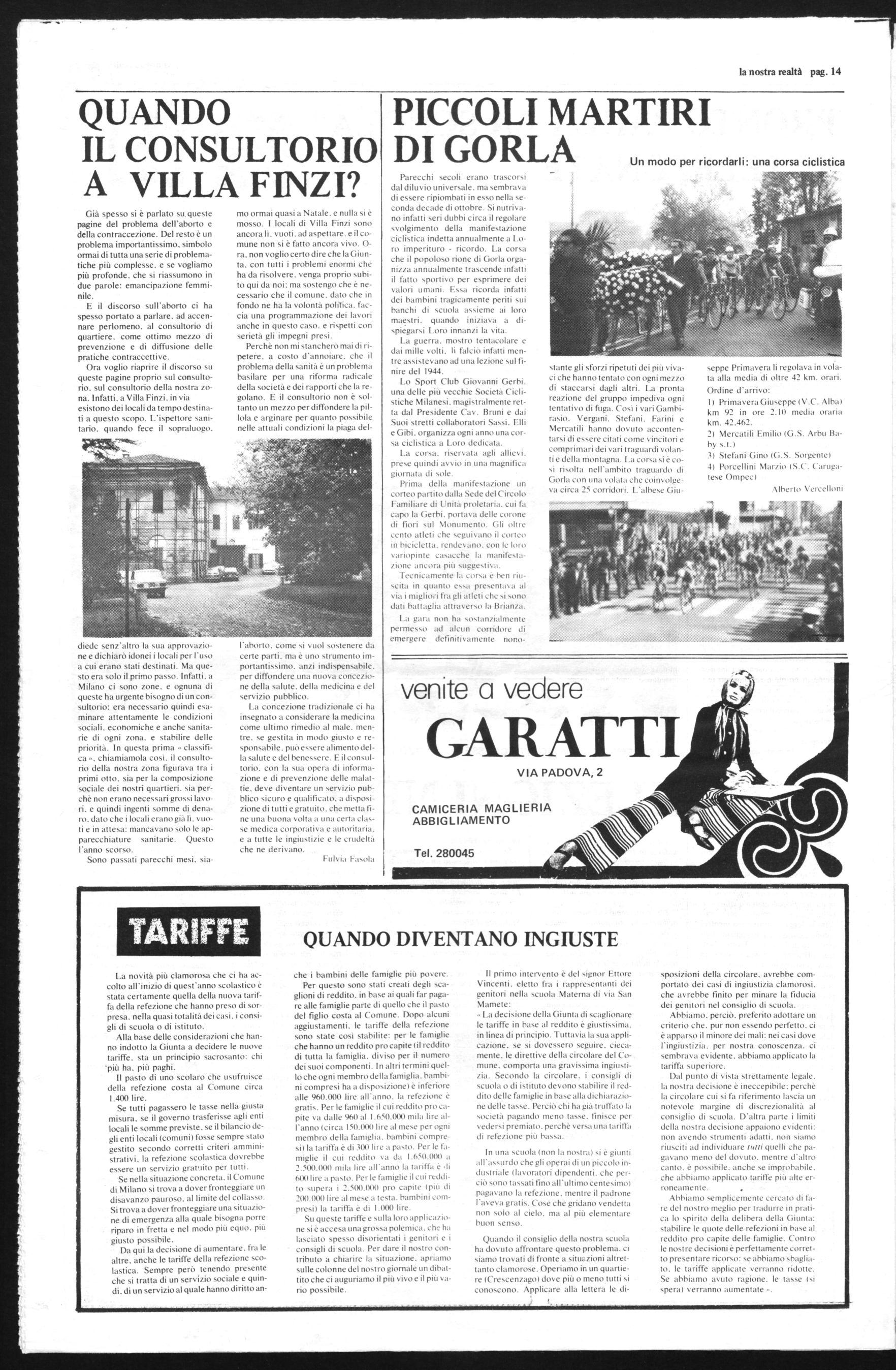 mo ormai quasi a Natale, e nulla si è mosso. I locali di Villa Finzi sono ancora lì. vuoti. ad aspettare. e il comune non si è fatto ancora vivo. Ora, non voglio certo dire che la Giunta, con tutti i problemi enormi che ha da risolvere. venga proprio subito qui da noi: ma sostengo che è necessario che il comune, dato che in fondo ne ha la volontà pohrica. faccia una programmazione dei lavori anche in questo caso. e rispetti con serietà gli impegni presi. Perchè non mi stancherò mai di ripeteie. a costo d'annoiare. che il problema della sanità è un problema basilare per una riforma radicale della società e dei rapporti che la regolano. E il consultorio non è soltanto un mezzo per diffondere la pillola e arginare per quanto possibile nelle attuali condizioni la piaga del-