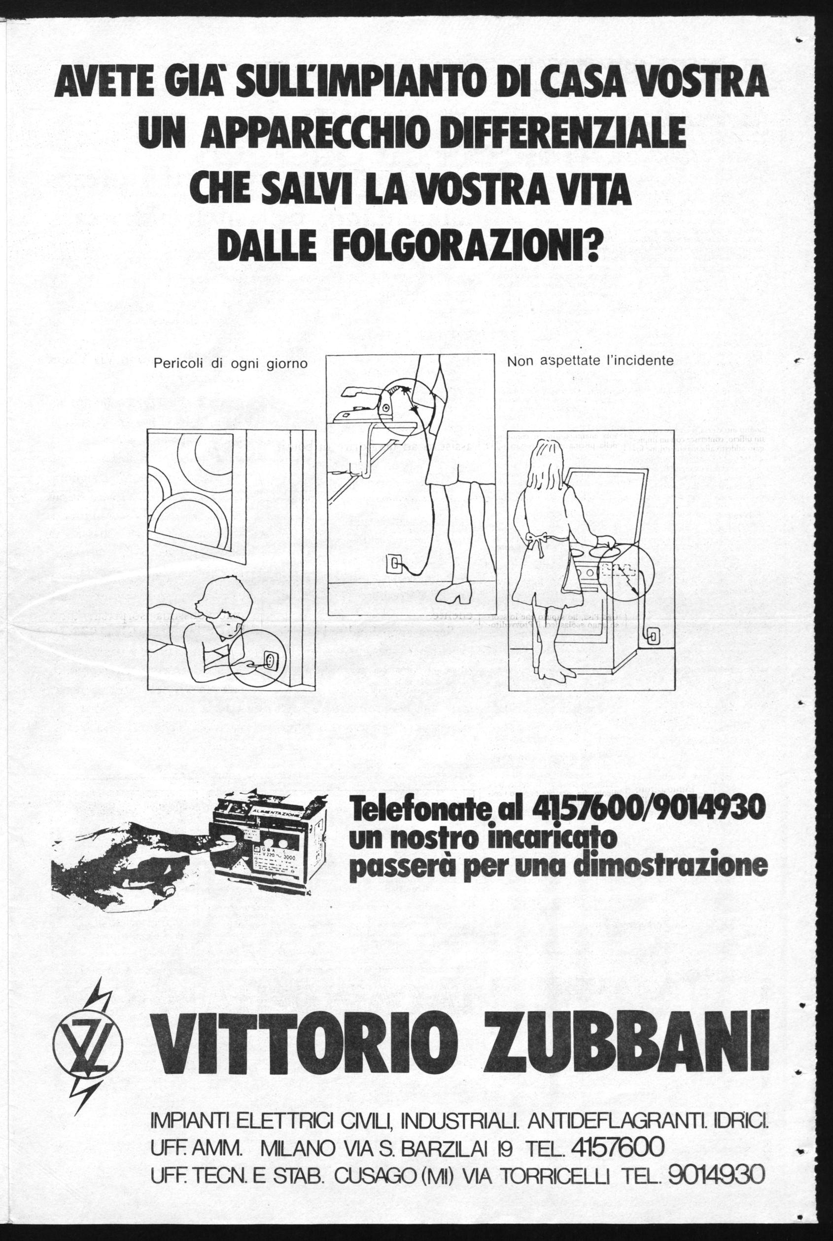 Non aspettate l'incidente Pericoli di ogni giorno AVETE G1K SULL'IMPIANTO DI CASA VOSTRA UN APPARECCHIO DIFFERENZIALE CHE SALVI LA VOSTRA VITA DALLE FOLGORAZIONI? Telefonate al 4157600/9014930 un nostro incaricato passerà per una dimostrazione VITTORIO ZUBBANI IMPIANTI ELETTRICI CIVILI, INDUSTRIALI. ANTIDEFLAGRANTI. IDRICI. UFF AMM. MILANO VIA S. BARZILAI 19 TEL. 4157600 UFF TECN. E STAB. CUSAGO (MI) VIA TORRICELLI TEL. 9014930
