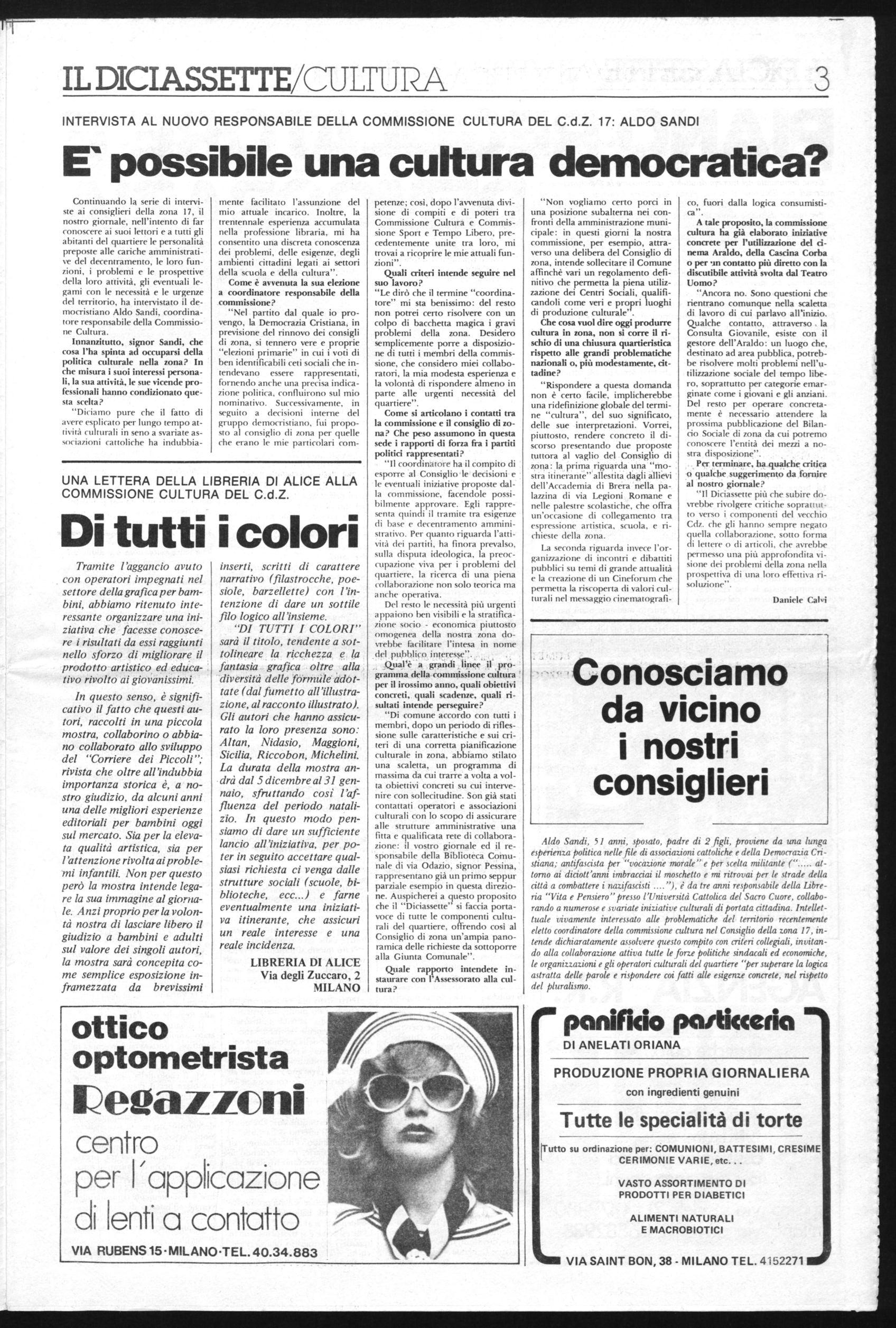 Sull'ultimo numero di Ghiaccio Sport, rivista della Federazione Italiana Sport su Ghiaccio, ho letto articoli che mi hanno immediatamente riportato ad una burrascosa seduta del Consiglio di Zona 17. In questa seduta, a proposito del possibile insediamento nella nostra Zona dei nuovi Magazzini Frigoriferi con annesso Palazzo del Ghiaccio, i rappresentanti democristiani e socialisti si sono ritrovati paladini ad oltranza del verde e feroci nemici sia dell'industria del freddo (secondo loro puramente speculativa: non importa se poi manca la possibilità di immagazzinare le carni congelate importate dalla CEE, che l'Amministrazione Comunale dovrebbe poi distribuire) sia dello sport su ghiaccio (che deve continuare a rimanere sport dei ricchi). Nell'articolo titolato l'Assessore vuole 6 palazzi del ghiaccio l'Assessore del PSI Paride Accetti - oltre appunto a dichiarare "a Milano occorrono almeno sei piste di ghiaccio" (almeno forse perchè si esclude la pista olimpionica? Infatti quando i socialisti hanno proposto le Olimpiadi a Milano, col tacito assenso dei democristiani, pensavano anche a quelle invernali!), ebbene Accetti dichiara all'intervistatore: "Guardi giù... Se fosse per me farei pattinare la gente anche lì.".. e indica il Sagrato del Duomo. Poi il nostro Accetti si lamenta della scarsità dei mezzi del Comune, quindi divaga, si distrae, parla dei problemi relativi all'insediamento di un nuovo Palazzo del Ghiaccio a Milano (quello in Zona 17). Il vortice rischia di travolgerci, scrive l'articolista: ma forse la "distrazione" è causata dall'Assessore più dalla "corrente" che dal "vortice".