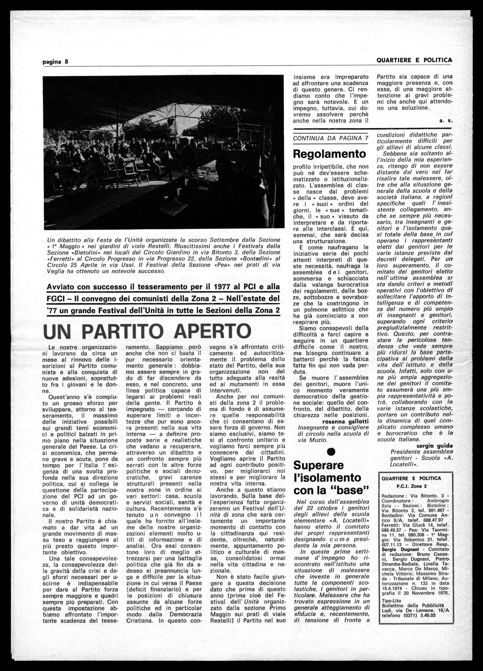 Ferretti: Via Gluck 14, telef_ 688.49.57 - Pea: Via Taormina 11, tel. 680.308 - 1° Maggio: Via Sebenico 21, telef. 607.11.13 -- Direttore Resp. Sergio Dugnani - Comitato di redazione: Bruno Cassani, Sergio Dugnani, Pietra Stramba-Badiale, Linella Tavacca, Marco De Marco, Michela Vittorio, Massimo Strada - Tribunale di Milano, Autorizzazione n. 133 in data 19.4.1974 - Chiuso in tipografia il 20 Novembre 1976.