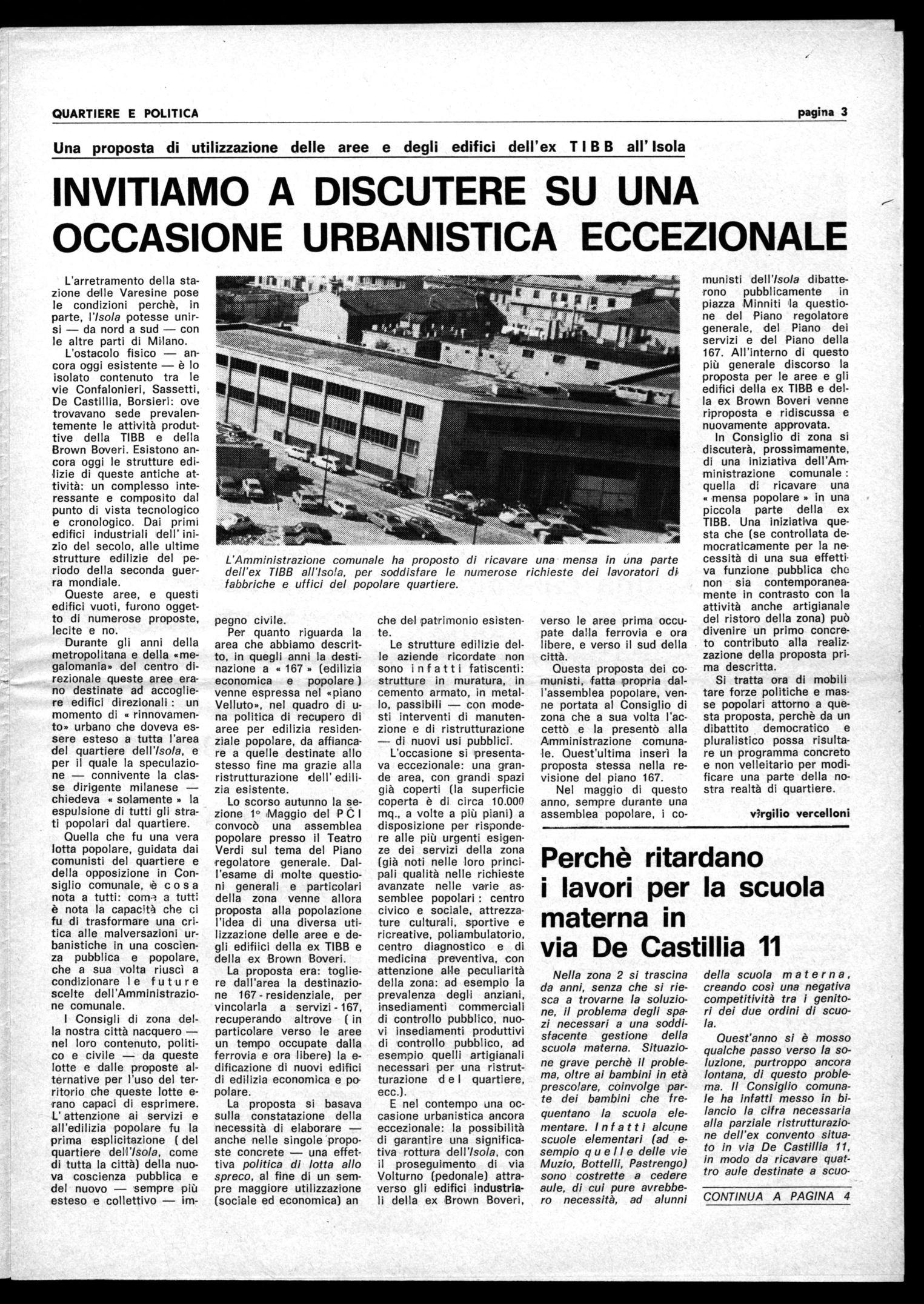 Il documento passa quindi ad esaminare la situazione delle scuole nella nostra zona, e in particolare nel quartiere Isola, situazione non certo positiva, a causa delle « scelte impopolari che le passate Amministrazioni — a maggioranza dc — fecero e tentarono poi ripetutamen• te di attuare». Le lotte popolari hanno impedito la distruzione del quartiere Isola e I' allontanamento dei suoi abitanti; ma la mancata programmazione di nuove scuole, dovuta alla difesa democristiana