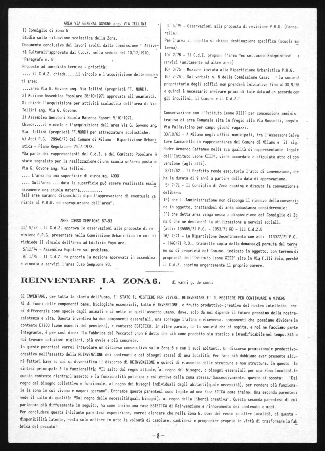 Dico tutto questo e ravvivo nella memoria dei cittadini alcune date che dal mio punto di vista erano e sono tutt'ora determinanti per o perare nel merito di quanto e come ci si era proposto. Nel luglio di quest'anno,1978, 1'AMM.CENTRALE aveva sciolto tutti i C.d Z. delle 20 Zone di Milano per poter rendere operante i suddetti Consigli in base alla legge sul Decentramento. dopo l'avvenuta riconferma e nomina dei successivi C.d.Z. e suoi Consiglieri, tutto ciò non si è avverato e siamo tutt'ora nell'impossibilità'latente di operare .nel modo che i cittadini si aspettano e nella volontà e intendimento degli stessi Consiglieri, mentre l'AMMINISTRAZIONE CENTRALE continua a far credere e sperare.