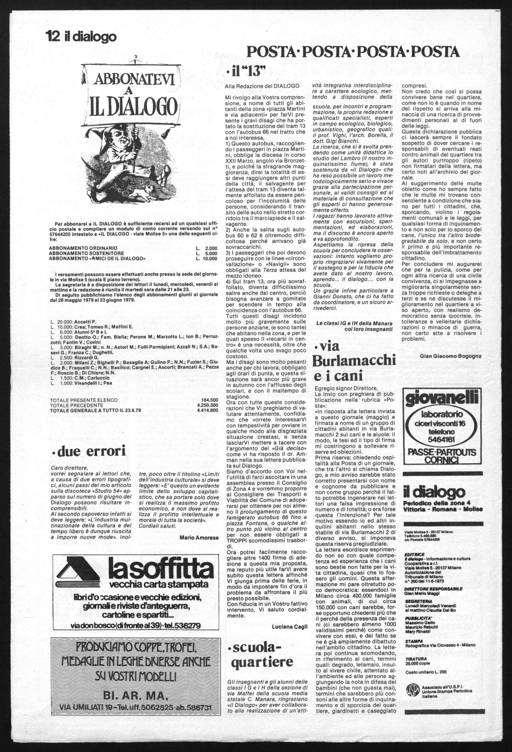 Ora con tutte queste considerazioni che Vi preghiamo di valutare attentamente, confidiamo che vorrete interessarVi con tempestività per ovviare in qualche modo alla disgraziata situazione creatasi, e senza lasciarVi mettere a tacere con l'argomento del «Già deciso» come vi ha risposto il dr. Amman nella sua lettera pubblicata sul Dialogo. Siamo d'accordo con Voi nell'utilità di farci ascoltare in una assemblea presso il Consiglio di Zona 4 e vorremmo proporre al Consigliere dei Trasporti e Viabilità del Comune di adoperarsi per ottenere per noi almeno il prolungamento di questo famigerato autobus 66 fino a piazza Fontana, o qualche altro punto più vicino al centro per non essere obbligati a TROPPI scomodissimi trasbordi.