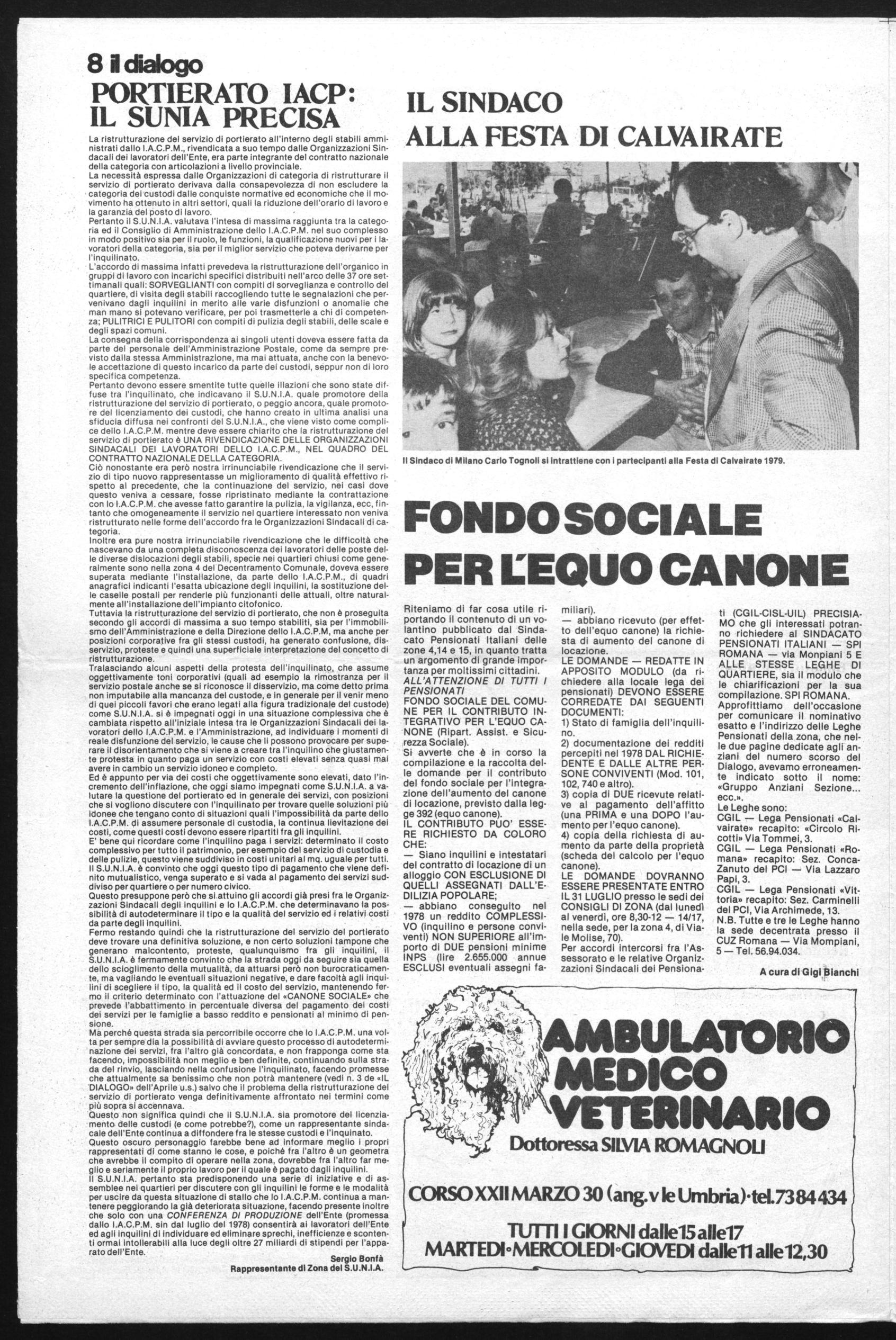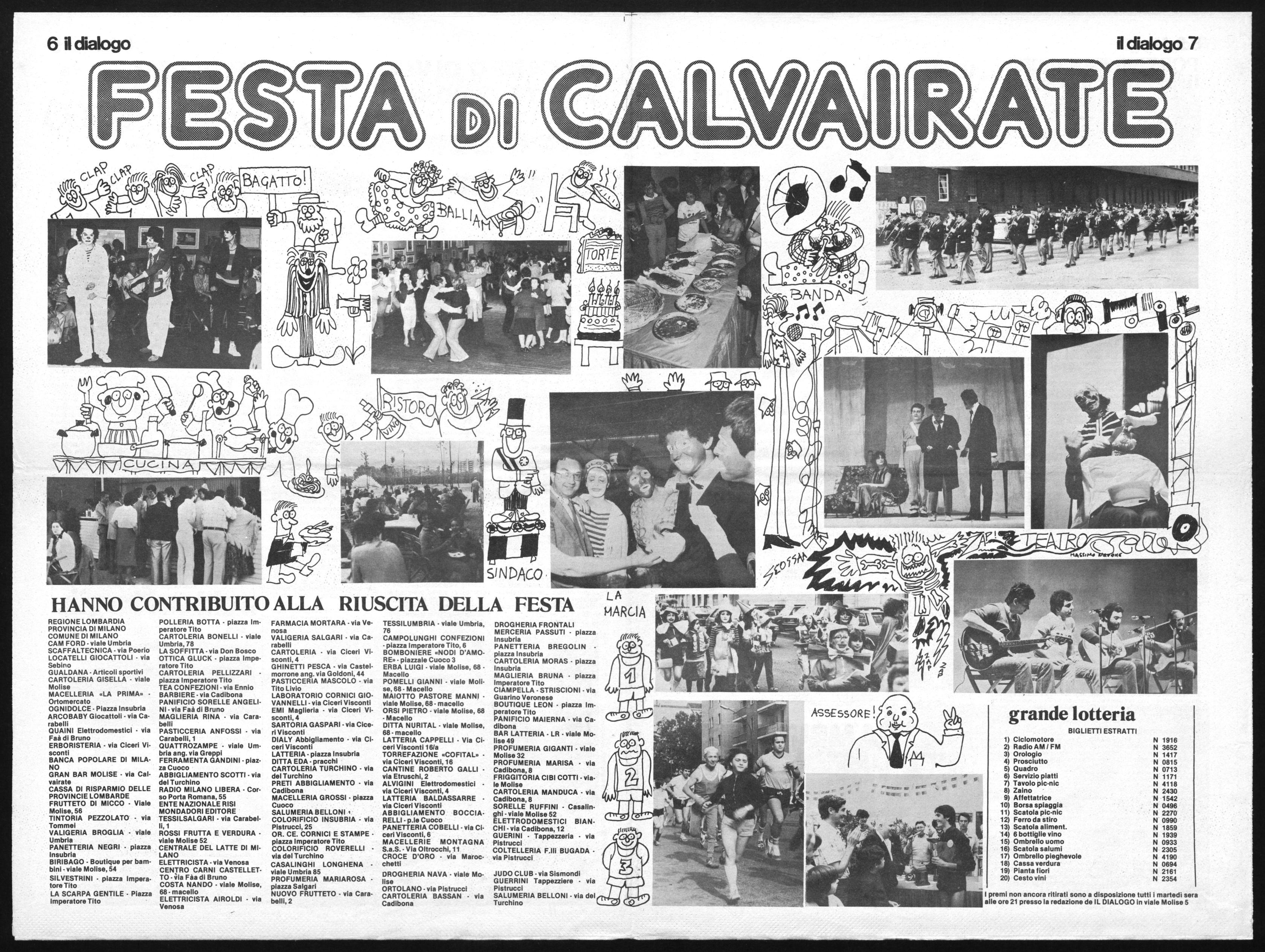 E' così Calvairate è potuto tornare un po' alle sue radici di antico borgo medioevale, come ha scritto la stampa cittadina, occupatasi largamente dell'avvenimento. Certamente senza la pretesa di tornare all'antico, perché ormai la città è città, bisogna però ammettere, e la Festa di Calvairate ci sembra lo abbia dimostrato, che esiste ancora l'entusiasmo per le cose fatte insieme, per una riscoperta di valori umani che trovano a livello locale la loro migliore capacità di espressione: un'area attrezzata come quella di P.le Cuoco, un po' di buona volontà ed un po' di fiducia nella gente, nei valori sociali e nell'anima popolare sempre viva, ha permesso in evidenza tutto ciò.