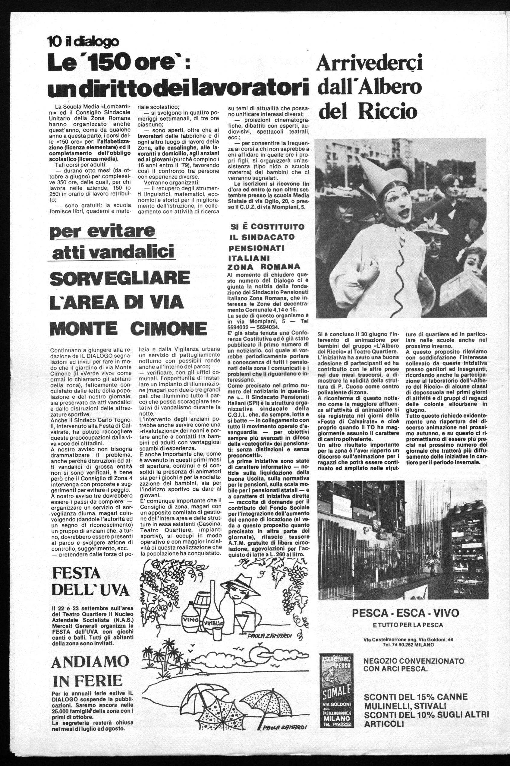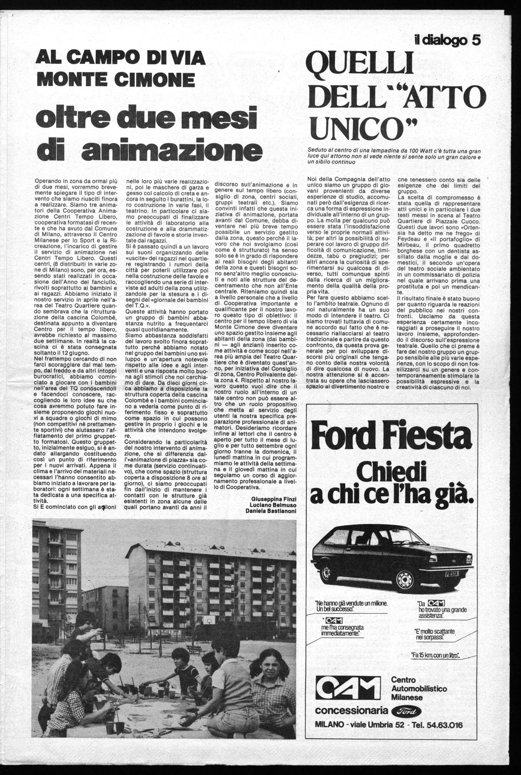 L'area tra piazzale Cuoco e l'Ortomercato, finalmente attrezzata dall'Amministrazione Comunale e restituita così ad un utilizzo proficuo da parte degli abitanti della Zona 4, le sistemazioni effettuate in occasione dell'anno internazionale del fanciullo, il Teatro Quartiere vestito e rifatto in maniera più decente, sono stati gli elementi strutturali «stabili» che hanno permesso di articolare la festa con tante iniziative. Le affollatissime serate di ballo popolare (con «Gli Scarpantibus» e i «Richy Group»), quelle musicali («Black Holes» e «T.B. Band»), gli spettacoli («Compagnia dell'Atto Unico», «Collettivo dell'Ovo»), i tornei per ragazzi, hanno potuto essere validamente organizzati anche per l'esistenza di una struttura come Teatro Quartiere. Da lì partivano i clovins della Nuova Compagnia del Bagatto per le loro «Gags» volanti in mezzo alla gente del quartiere; lì veniva condotta l'animazione per i più piccoli svolta dalla Cooperativa Animazione Centri Tempo Libero, quella per i ragazzi, voluta dalla Zona e condotta tutti i giorni dal gruppo di animatori dell'«Albero del Riccio», non solo sull'area di Teatro Quartiere, ma con frequenti puntate e sfilate colorate, divertenti e perfino commoventi dei ragazzi in festa per tutto il quartiere, il ristoro, gli stands dei giochi, dei libri, la giostra, hanno trovato una collocazione appropriata in quell'area attrezzata dove i ragazzi possono giocare, andare e venire, confondersi tra la gente senza perdersi e senza incontrare pericoli, sapendo che cento occhi curano la loro sicurezza.