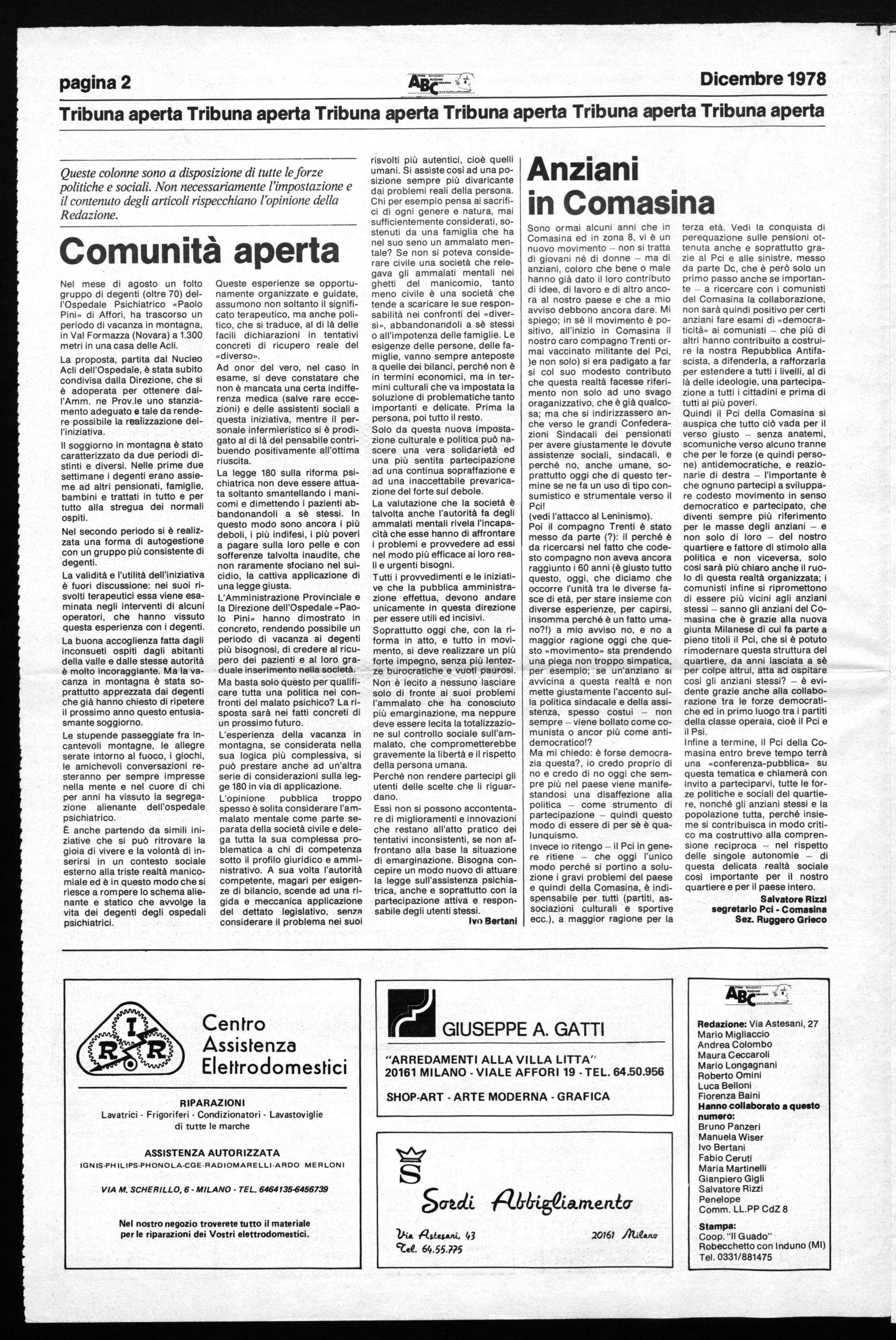 Quindi il Pci della Comasina si auspica che tutto ciò vada per il verso giusto — senza anatemi, scomuniche verso alcuno tranne che per le forze (e quindi persone) antidemocratiche, e reazionarie di destra l'importante è che ognuno partecipi a sviluppare codesto movimento in senso democratico e partecipato, che diventi sempre più riferimento per le masse degli anziani — e non solo di loro — del nostro quartiere e fattore di stimolo alla politica e non viceversa, solo così sarà più chiaro anche il ruolo di questa realtà organizzata; i comunisti infine si ripromettono di essere più vicini agli anziani stessi — sanno gli anziani del Comasina che è grazie alla nuova giunta Milanese di cui fa parte a pieno titoli il Pci, che si è potuto rimodernare questa struttura del quartiere, da anni lasciata a sè per colpe altrui, atta ad ospitare così gli anziani stessi? — è evidente grazie anche alla collaborazione tra le forze democratiche ed in primo luogo tra i partiti della classe operaia, cioè il Pci e il Psi.