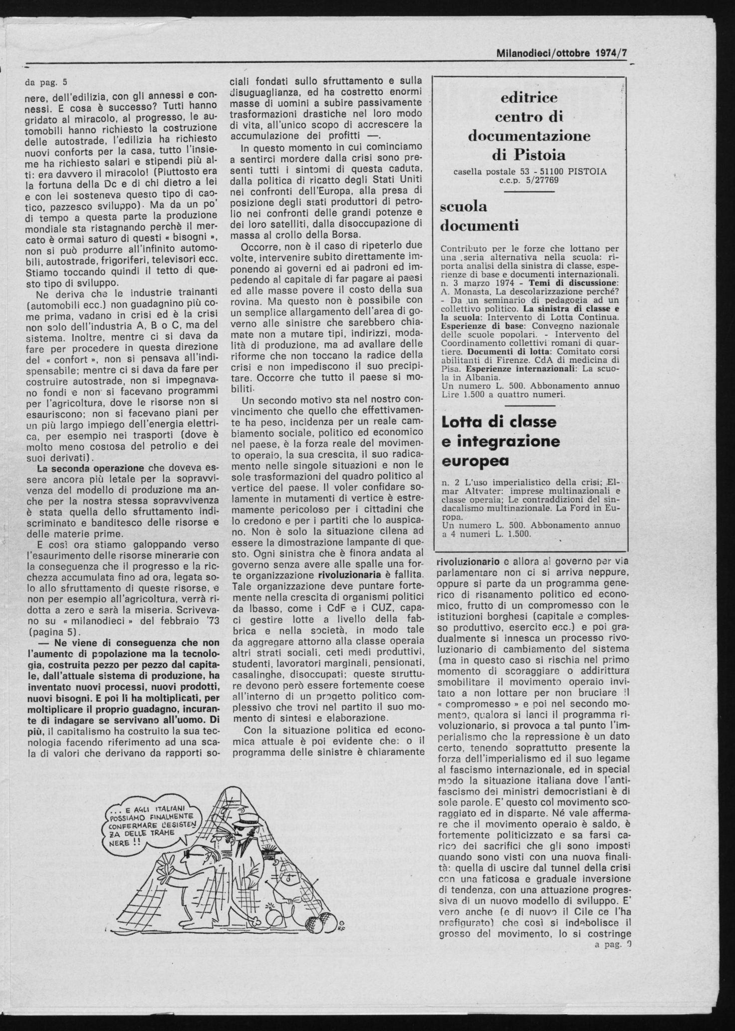 E' certo che nella vertenza cittadina contro il Comune e la Regione sull'aumento del costo dei trasporti, delle bollette della luce, del gas, dell'acqua, del riscaldamento, dei libri di testo, si deve inserire anche il punto che riguarda le aule della scuola dell'obbligo e dei nidi d'infanzia. Non dobbiamo lasciarci intimidire dalle manovre del Governo e del padronato: alcuni organismi sindacali l'hanno ben compreso (vedi Torino, Napoli, Bolzano, Asti, Cuneo) come pure alcuni Consigli Unitari di Zona di Milano (la Zona Sindacale Sempione): si tratta di essere con loro in questa lotta generalizzata e di inserire, oltre al pagamento di bollette e libri scolastici al prezzo vecchio, l'urgenza della scuola di Via Cesalpino come di altre scuole dell'obbligo a Milano.