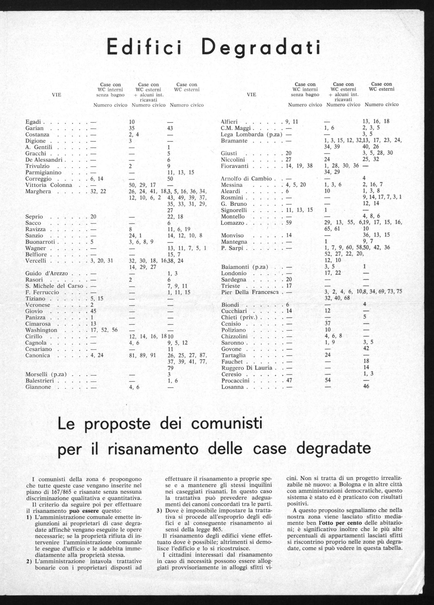 Si può rimanere increduli di fronte a tali constatazioni, perchè si stenta a concepire una simile realtà in pieno 1974. Per questo vogliamo fornire l'elenco dettagliato di tutti gli edifici malsani via per via, numero civico per numero civico.