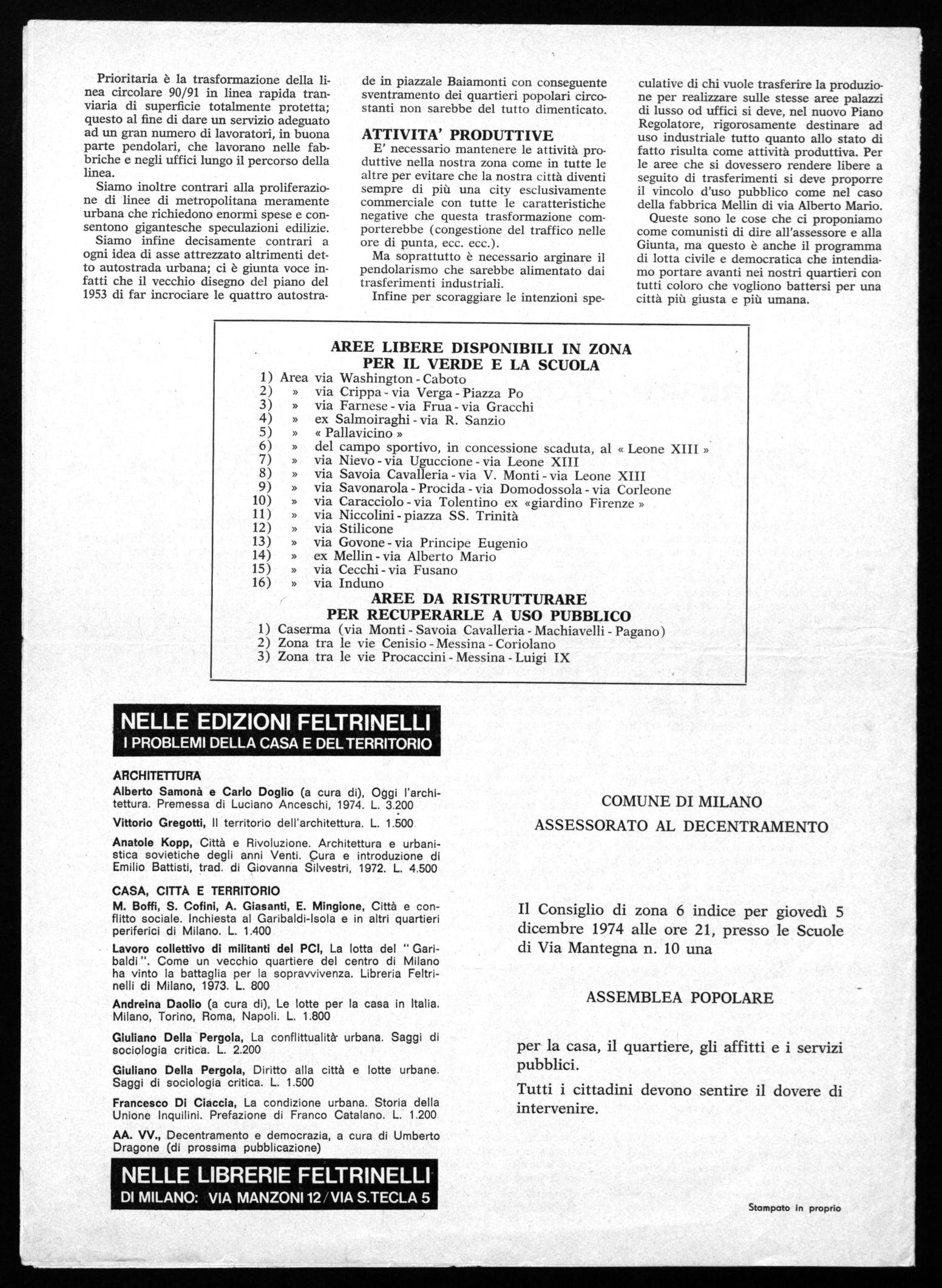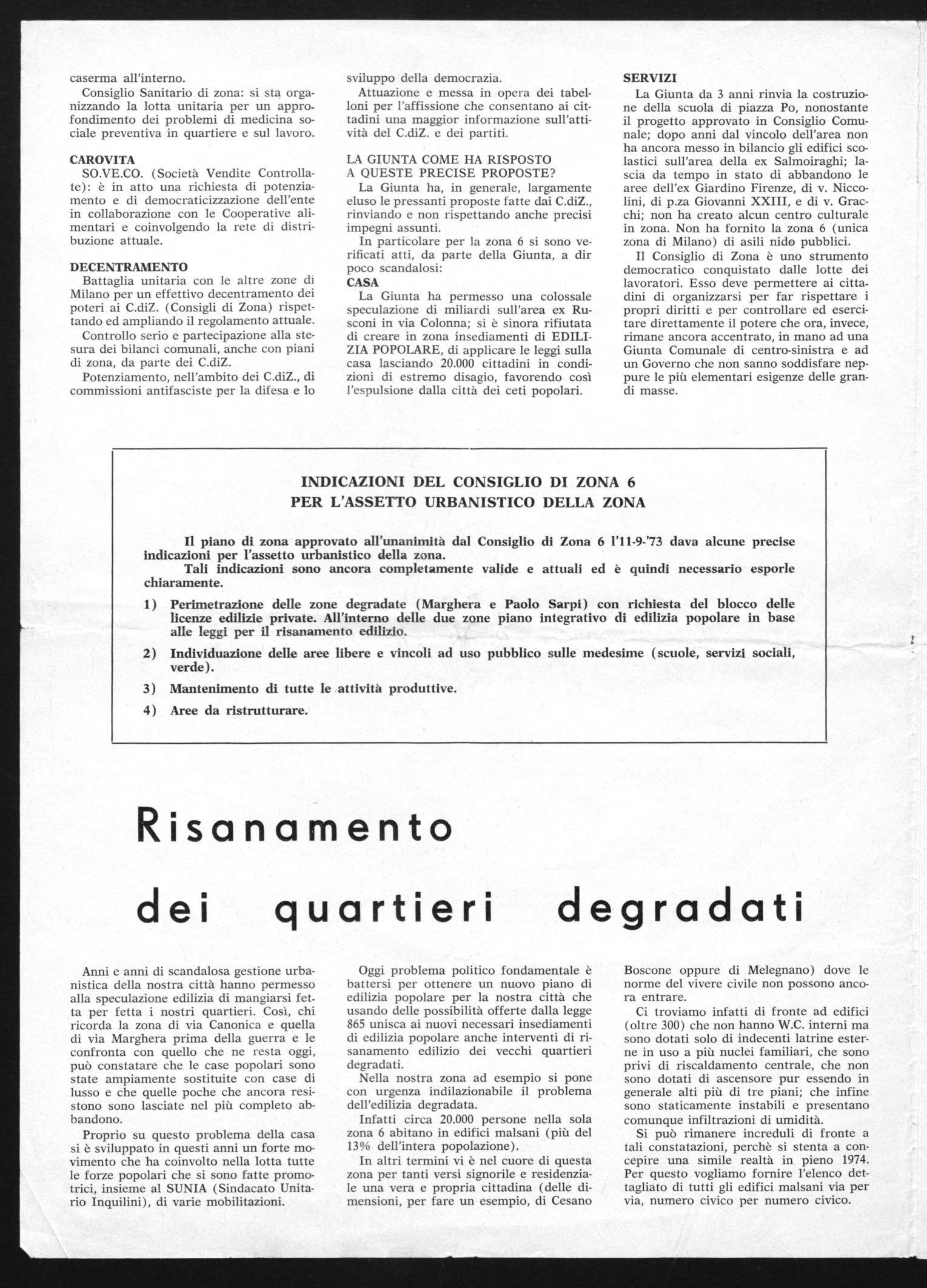 La Giunta da 3 anni rinvia la costruzione della scuola di piazza Po, nonostante il progetto approvato in Consiglio Comunale; dopo anni dal vincolo dell'area non ha ancora messo in bilancio gli edifici scolastici sull'area della ex Salmoiraghi; lascia da tempo in stato di abbandono le aree dell'ex Giardino Firenze, di v. Niccolini, di p.za Giovanni XXIII, e di v. Gracchi; non ha creato alcun centro culturale in zona. Non ha fornito la zona 6 (unica zona di Milano) di asili nido pubblici. Il Consiglio di Zona è uno strumento democratico conquistato dalle lotte dei lavoratori. Esso deve permettere ai cittadini di organizzarsi per far rispettare i propri diritti e per controllare ed esercitare direttamente il potere che ora, invece, rimane ancora accentrato, in mano ad una Giunta Comunale di centro-sinistra e ad un Governo che non sanno soddisfare neppure le più elementari esigenze delle grandi masse.