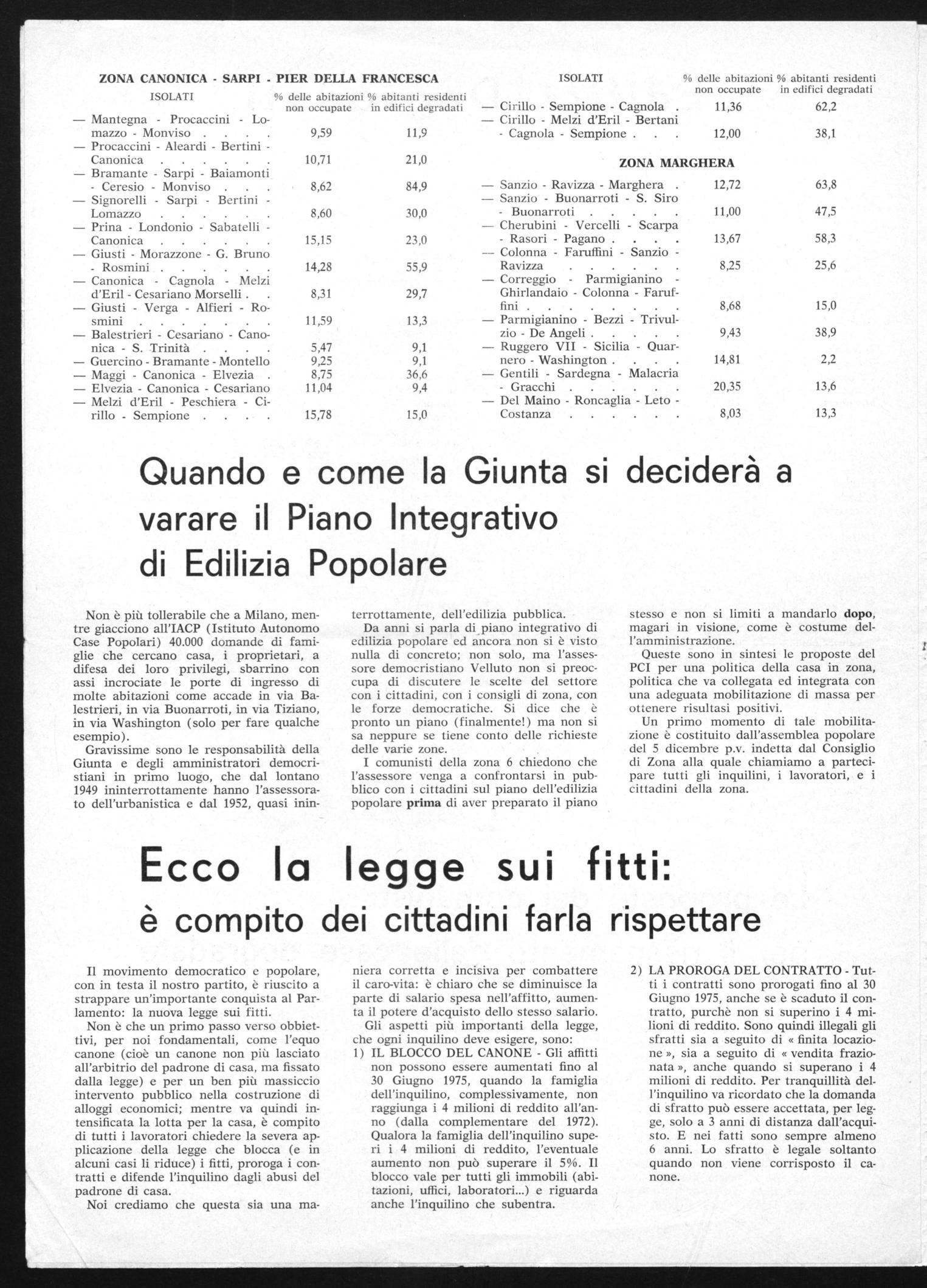 Da anni si parla di_piano integrativo di edilizia popolare ed ancora non si è visto nulla di concreto; non solo, ma l'assessore democristiano Velluto non si preoccupa di discutere le scelte del settore con i cittadini, con i consigli di zona, con le forze democratiche. Si dice che è pronto un piano (finalmente!) ma non si sa neppure se tiene conto delle richieste delle varie zone.