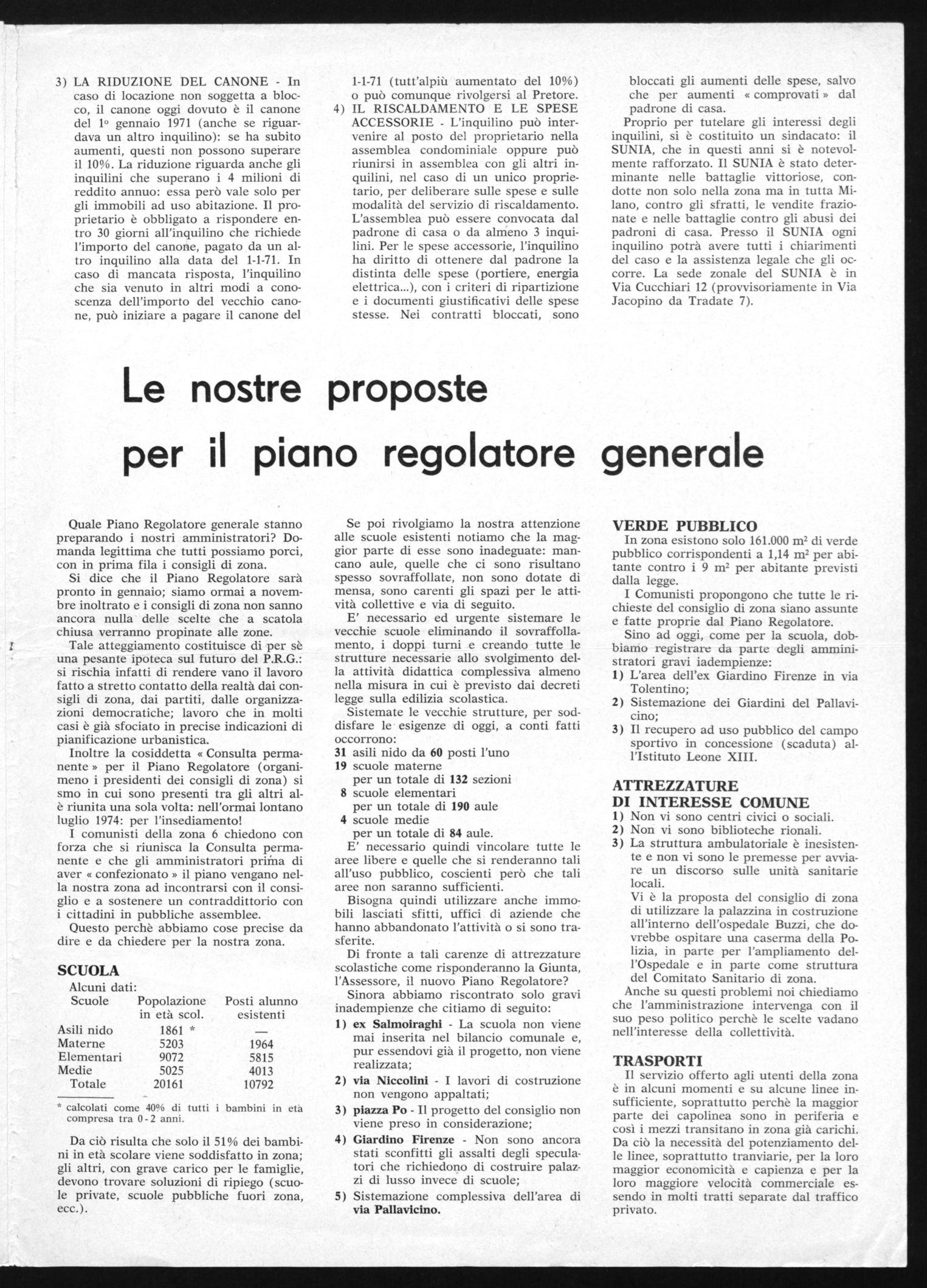 I Comunisti propongono che tutte le richieste del consiglio di zona siano assunte e fatte proprie dal Piano Regolatore. Sino ad oggi, come per la scuola, dobbiamo registrare da parte degli amministratori gravi iadempienze: