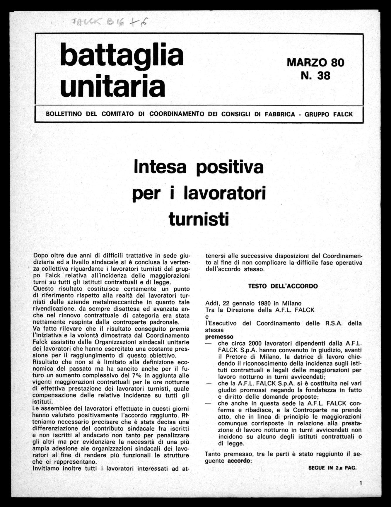 Va fatto rilevare che il risultato conseguito premia l'iniziativa e la volontà dimostrata dal Coordinamento Falck assistito dalle Organizzazioni sindacali unitarie dei lavoratori che hanno esercitato una costante pressione per il raggiungimento di questo obiettivo. Risultato che non si è limitato alla definizione economica del passato ma ha sancito anche per il futuro un aumento complessivo del 7% in aggiunta alle vigenti maggiorazioni contrattuali per le ore notturne di effettiva prestazione dei lavoratori turnisti, quale compensazione delle relative incidenze su tutti gli istituti.