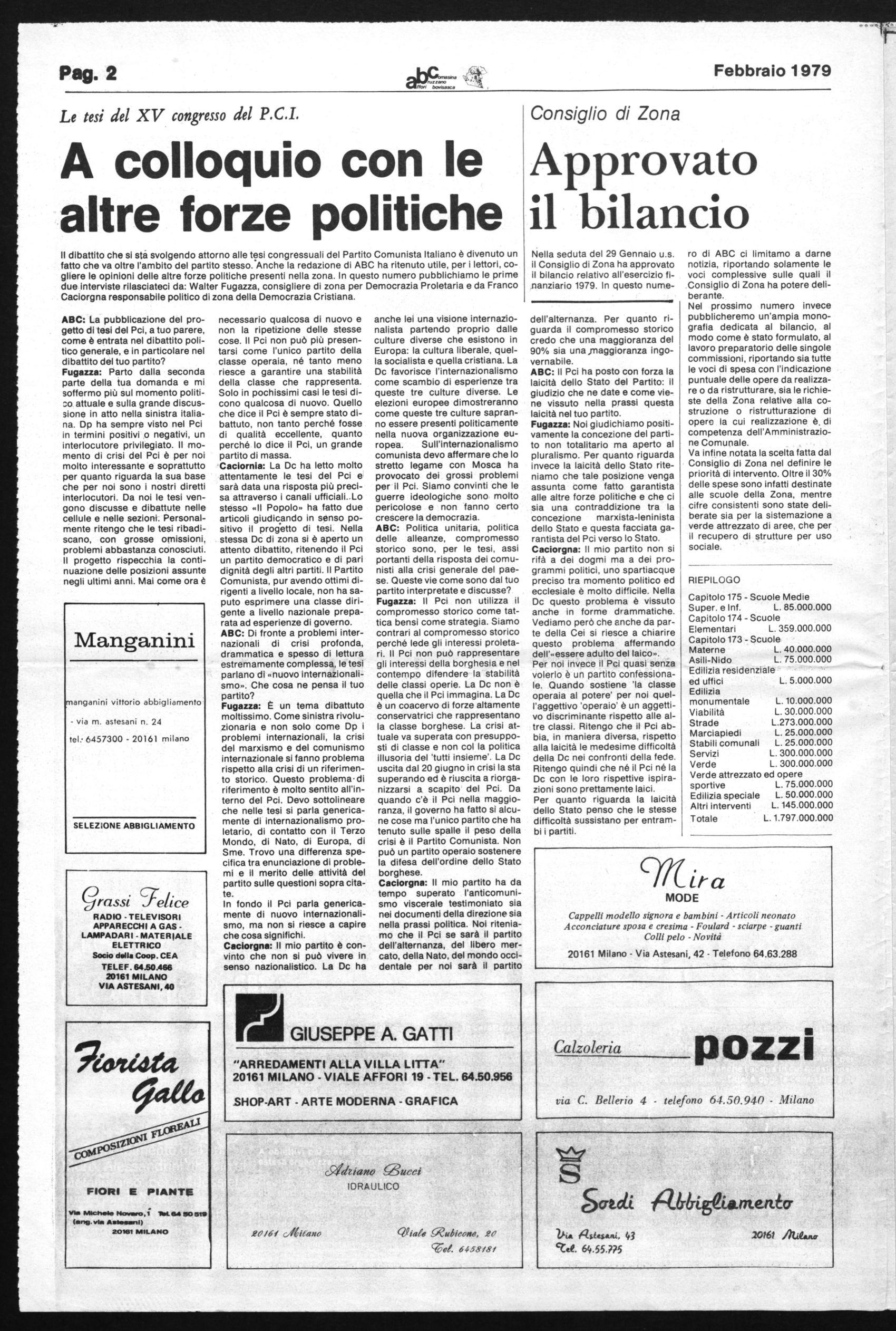 Il dibattito che si sta svolgendo attorno alle tesi congressuali del Partito Comunista Italiano è divenuto un fatto che va oltre l'ambito del partito stesso:Anche la redazione di ABC ha ritenuto utile, per i lettori, cogliere le opinioni delle altre forze politiche presenti nella zona. In questo numero pubblichiamo le prime due interviste rilasciateci da: Walter Fugazza, consigliere di zona per Democrazia Proletaria e da Franco Caciorgna responsabile politico di zona della Democrazia Cristiana.