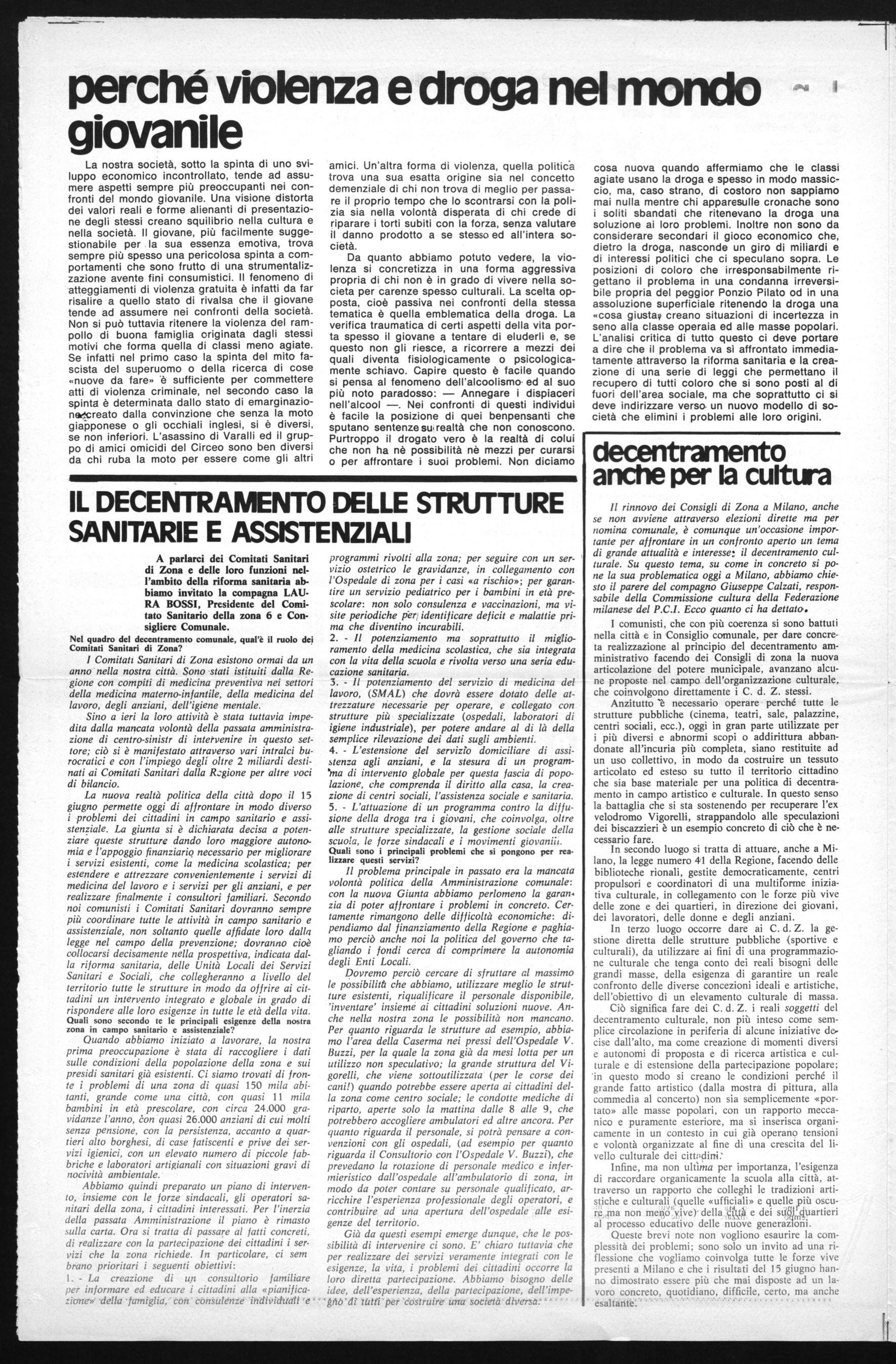 Adesso la discussione che più ci preme è quella con i cittadini. E la faremo. I nostri candidati anche se ora non sono più tali perchè non vengono eletti direttamente dai cittadini ma nominati dal Comune, questo confronto con il maggior numero possibile di cittadini lo porteranno avanti egualmente. Perchè solo in questo modo, solo se riusciremo ad ampliare e ad articolare sempre di più il legame tra le forze politiche democratiche e la cittadinanza, il nostro Consiglio di zona potrà diventare il centro di un reale potere amministrativo. Solo in questo modo, battendo anche qui, nella Zona Magenta-Sempione, le forze conservatrici e reazionarie, battendo le forze della divisione, solo così il nostro Consiglio di zona potrà essere lo strumento di un'ampia partecipazione di massa non soltanto al dibattito e al confronto, non soltanto al controllo democratico, ma anche alla gestione concreta dei programmi e degli interventi pubblici.