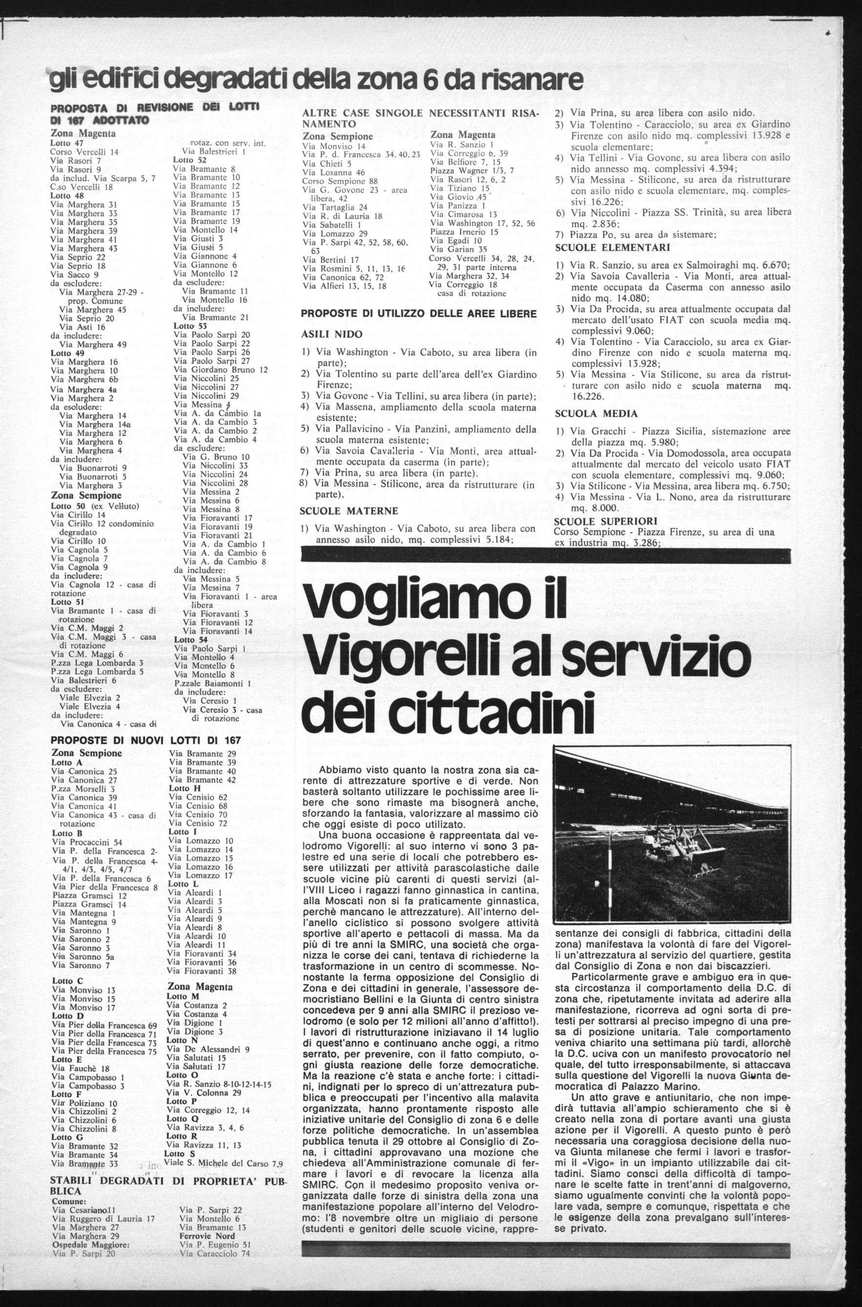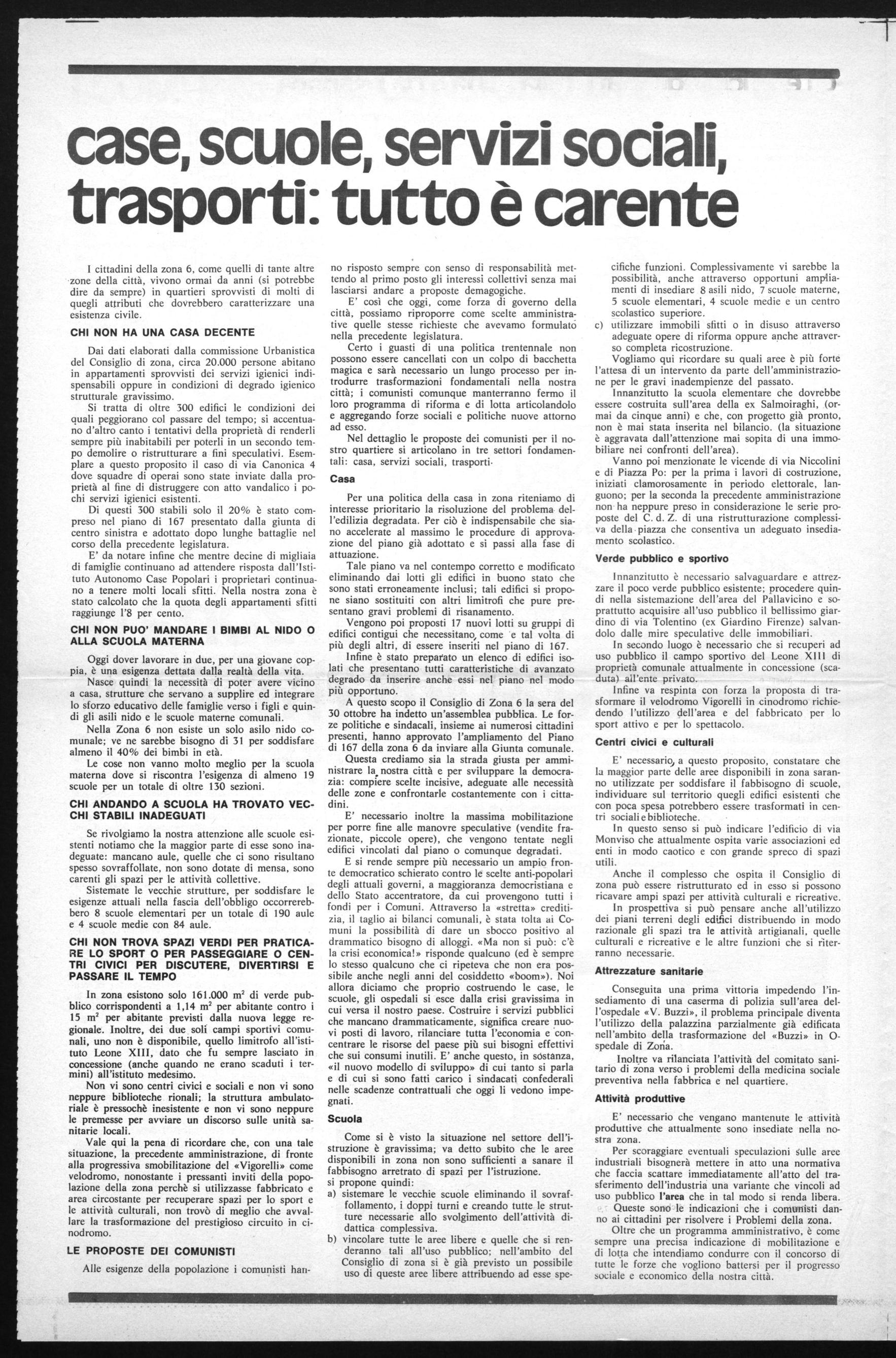 alla cassa integrazione può servire allo scopo), perché in questo modo la nostra zona finirebbe per trasformarsi definitivamente in un grigio agglomerato residenziale con caratteristiche da «city» commerciale. Queste sono le cose che vogliamo cambiare, che pensiamo possano essere cambiate con il confronto, la partecipazione, l'unità. In altre parti di questo giornale i problemi qui solo accennati trovano più ampia trattazione e, quel che più conta, sono accompagnati da proposte che ci sembrano serie e meditate. Si tratta di proposte che avevamo a lungo analizzate e discusse con i candidati della nostra lista, chiamandoli in tal modo a impegnarsi direttamente con gli elettori.