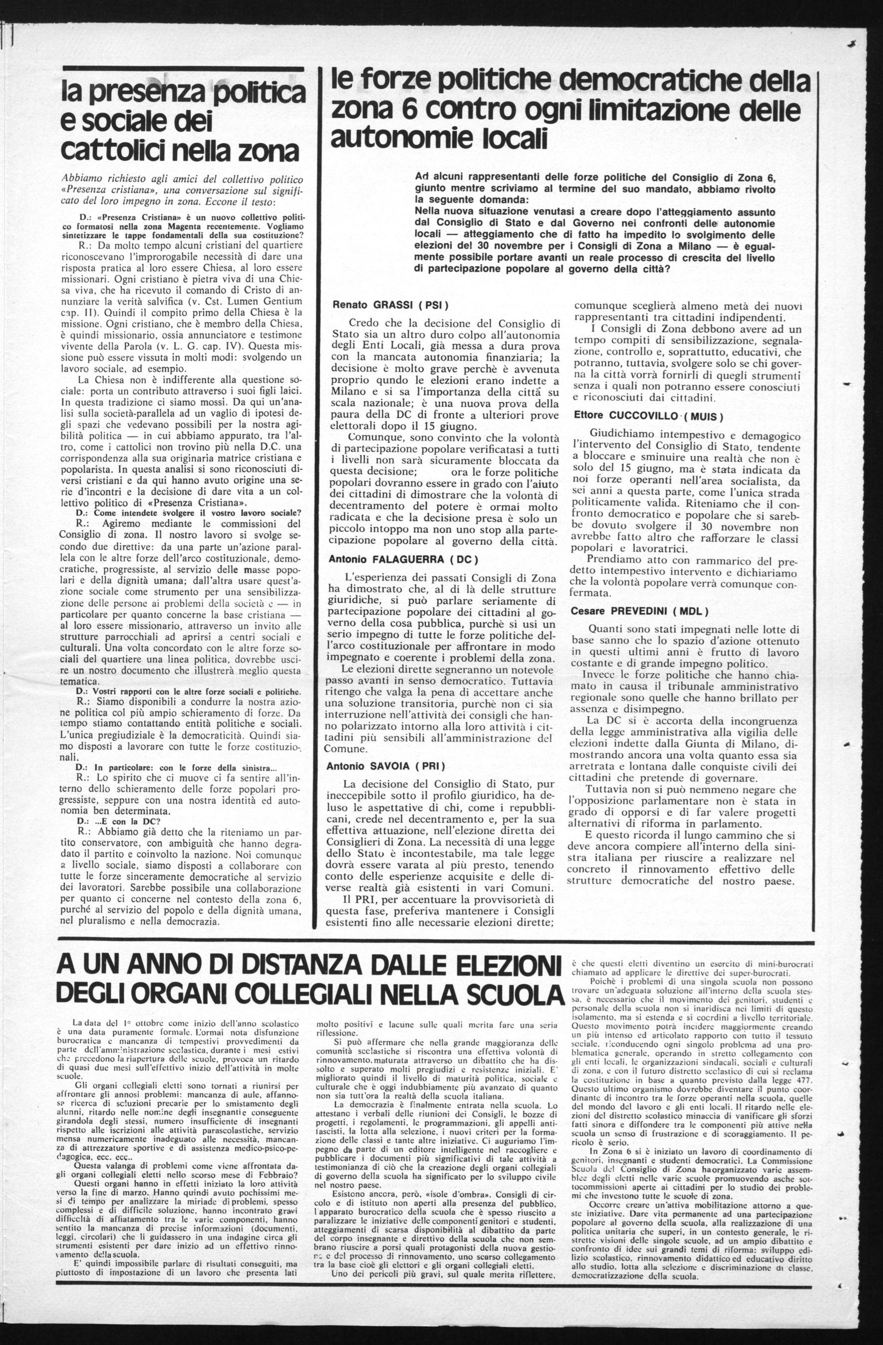 Ad alcuni rappresentanti delle forze politiche del Consiglio di Zona 6, giunto mentre scriviamo al termine del suo mandato, abbiamo rivolto la seguente domanda: Nella nuova situazione venutasi a creare dopo l'atteggiamento assunto dal Consiglio di Stato e dal Governo nei confronti delle autonomie locali — atteggiamento che di fatto ha impedito lo svolgimento delle elezioni del 30 novembre per i Consigli di Zona a Milano — è egualmente possibile portare avanti un reale processo di crescita del livello di partecipazione popolare al governo della città?