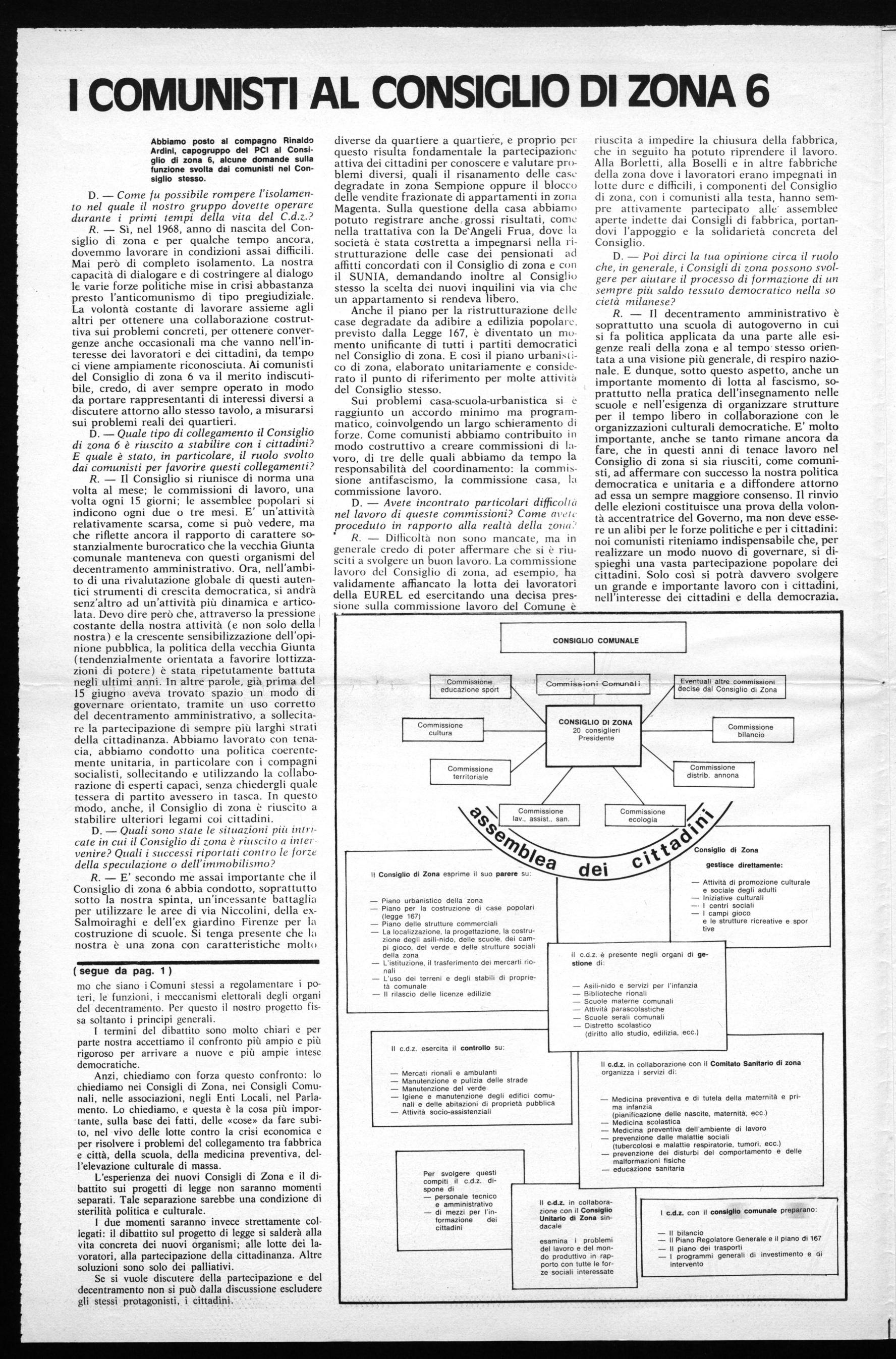 La giunta si è imposto giustamente il rispetto di• un impegno che il Consiglio Comunale approvò a strà grande maggioranza (hanno votato contro solo i liberali) già prima del 15 giugno. Tuttavia è necessario guardare più in profondità; i Consigli di Zona a Milano, come ogni esperienza di partecipazione e di decentramento, hanno una parte fondamentale nella strategia generale del nostro movimento. C'è una nuova spinta democratica che scuote la struttura decrepita dell'attuale legislazione accentratrice e burocratica.