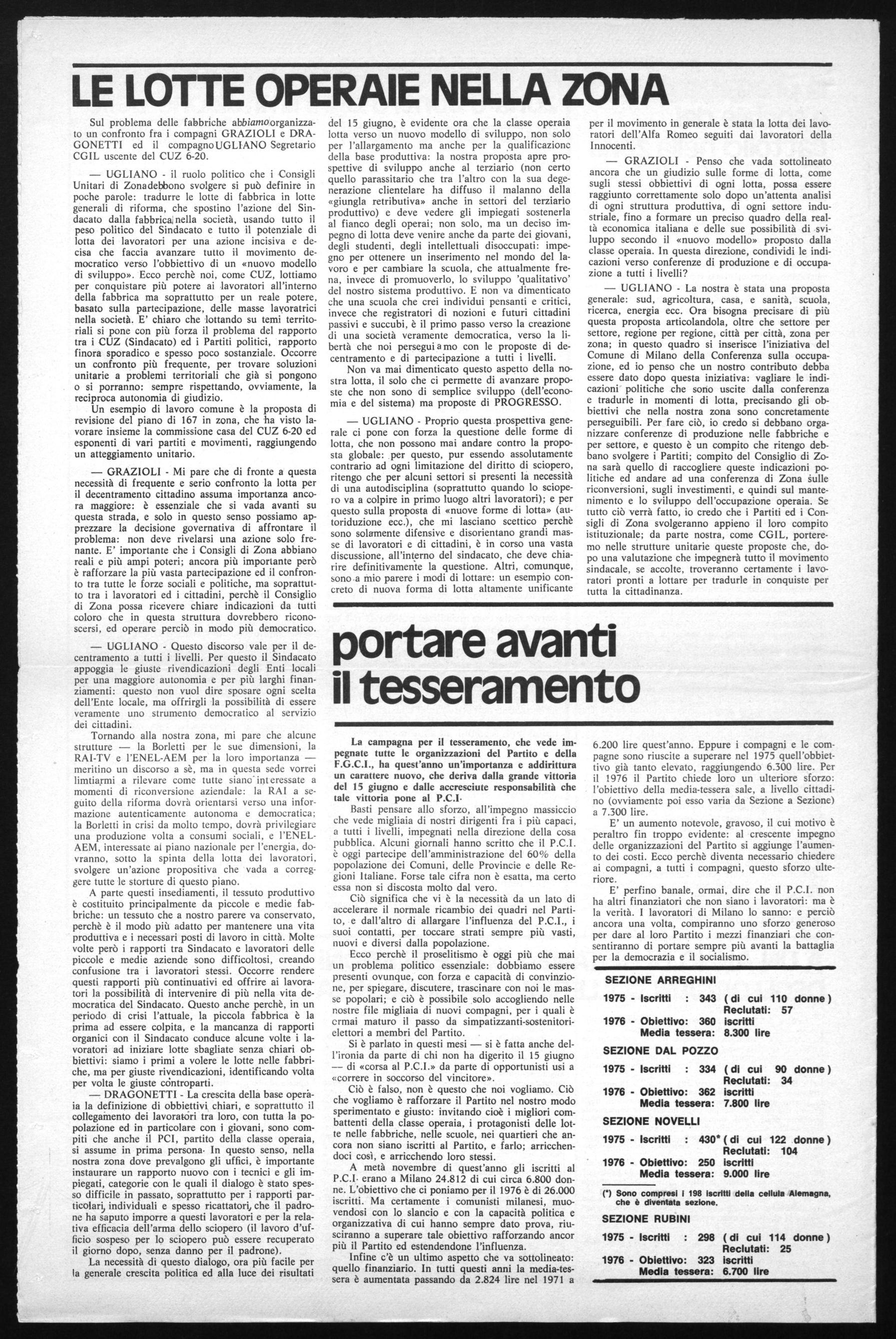 A metà novembre di quest'anno gli iscritti al P.C.I. erano a Milano 24.812 di cui circa 6.800 donne. L'obiettivo che ci poniamo per il 1976 è di 26.000 iscritti. Ma certamente i comunisti milanesi, muovendosi con lo slancio e con la capacità politica e organizzativa di cui hanno sempre dato prova, riusciranno a superare tale obiettivo rafforzando ancor più il Partito ed estendendone l'influenza.