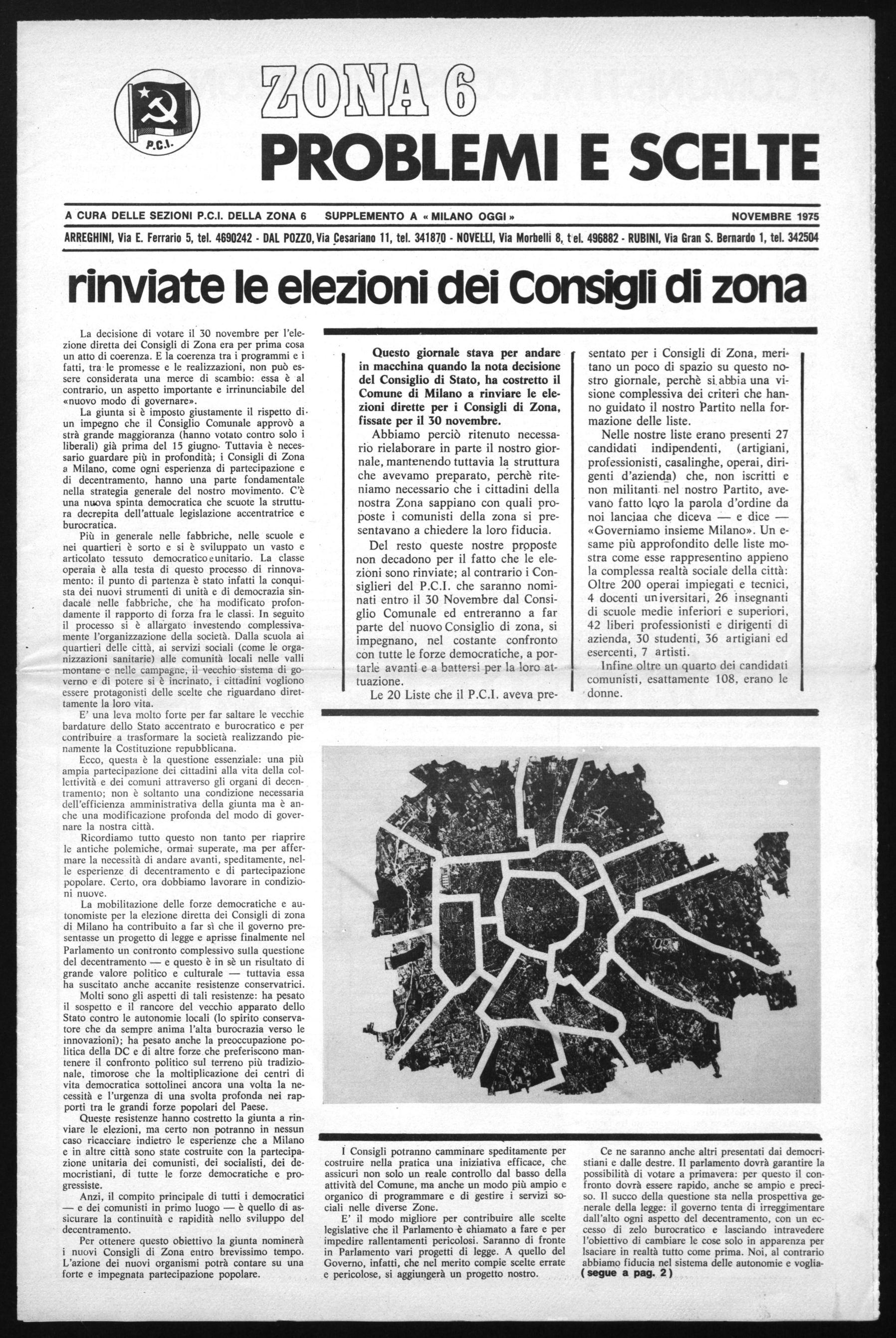 Del resto queste nostre proposte non decadono per il fatto che le elezioni sono rinviate; al contrario i Consiglieri del P.C.I. che saranno nominati entro il 30 Novembre dal Consiglio Comunale ed entreranno a far parte del nuovo Consiglio di zona, si impegnano, nel costante confronto con tutte le forze democratiche, a portarle avanti e a battersi per la loro attuazione.