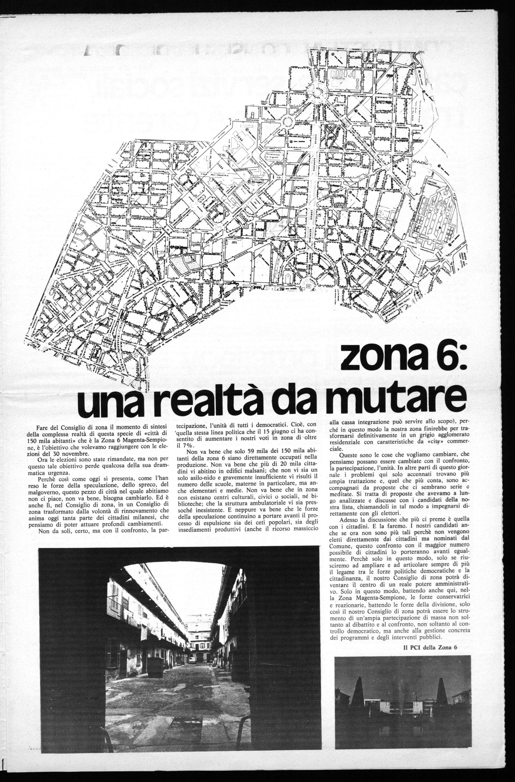tecipazione, l'unità di tutti i democratici. Cioè, con 'quella stessa linea politica che il 15 giugno ci ha consentito di aumentare i nostri voti in zona di oltre il 7%. Non va bene che solo 59 mila dei 150 mila abitanti della zona 6 siano direttamente occupati nella produzione. Non va bene che più di 20 mila cittadini vi abitino in edifici malsani; che non vi sia un solo asilo-nido e gravemente insufficiente vi risulti il numero delle scuole, materne in particolare, ma anche elementari e medie. Non va bene che in zona non esistano centri culturali, civici o sociali, né biblioteche; che la struttura ambulatoriale vi sia pressoché inesistente. E neppure va bene che le forze della speculazione continuino a portare avanti il processo di espulsione sia dei ceti popolari, sia degli insediamenti produttivi (anche il ricorso massiccio