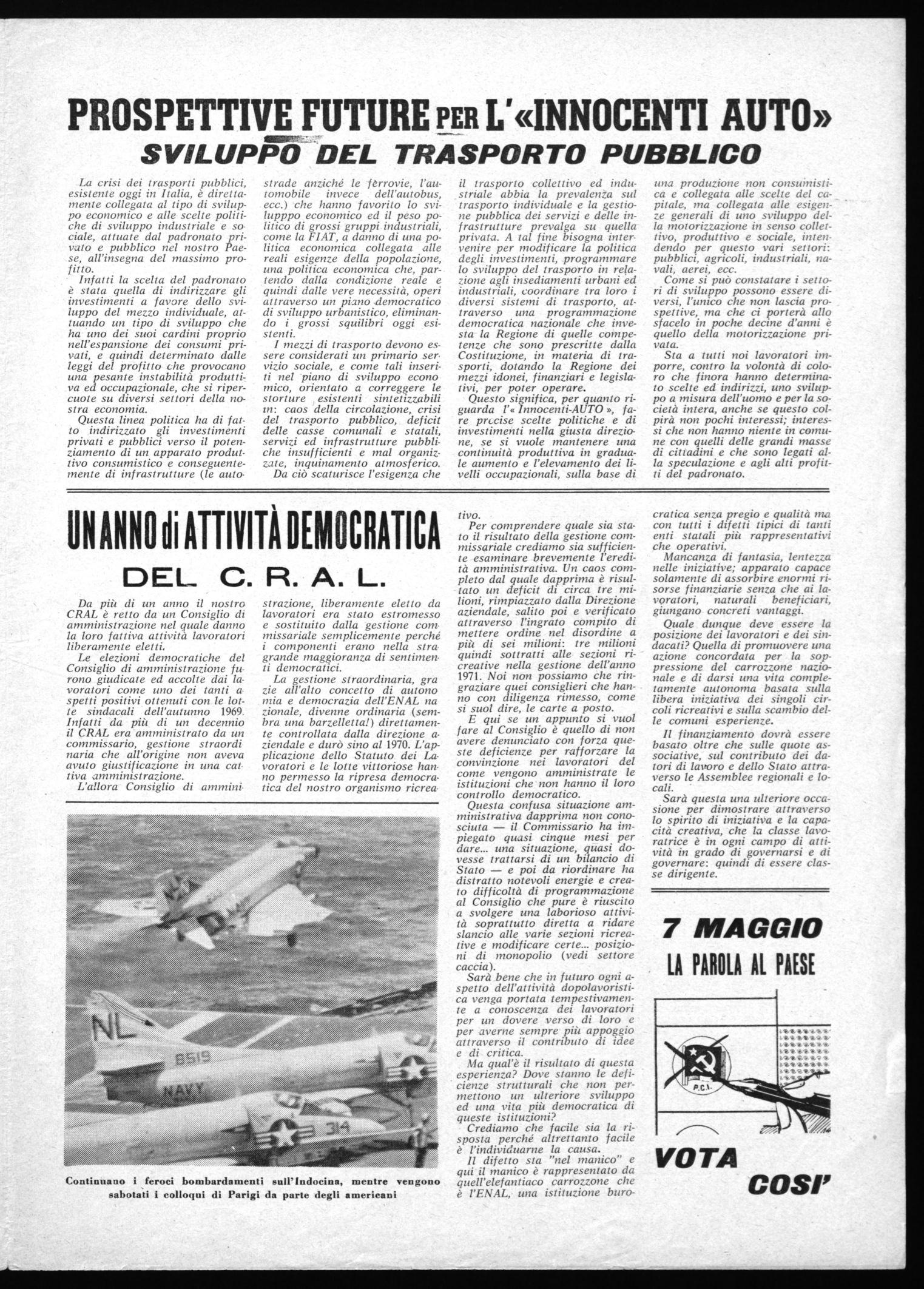 strade anziché le ferrovie, l'automobile invece dell'autobus, ecc.) che hanno favorito lo svilupppo economico ed il peso politico di grossi gruppi industriali, come la FIAT, a danno di una politica economica collegata alle reali esigenze della popolazione, una politica economica che, partendo dalla condizione reale e quindi dalle vere necessità, operi attraverso un piano democratico di sviluppo urbanistico, eliminando i grossi squilibri oggi esistenti.