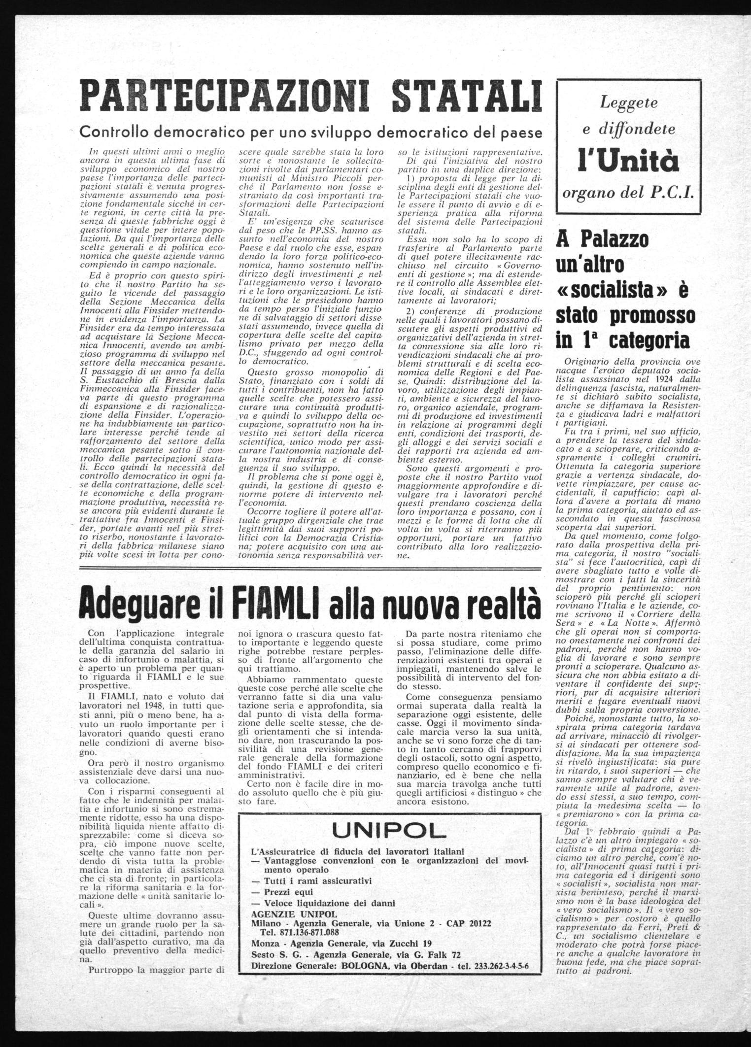 In questi ultimi anni o meglio ancora in questa ultima fase di sviluppo economico del nostro paese l'importanza delle partecipazioni statali è venuta progressivamente assumendo una posizione fondamentale sicché in certe regioni, in certe città la presenza di queste fabbriche oggi è questione vitale per intere popolazioni. Da qui l'importanza delle scelte generali e di politica economica che queste aziende vanno compiendo in campo nazionale. Ed è proprio con questo spirito che il nostro Partito ha seguito le vicende del passaggio della Sezione Meccanica della Innocenti alla Finsider mettendone in evidenza l'importanza. La Finsider era da tempo interessata ad acquistare la Sezione Meccanica Innocenti, avendo un ambizioso programma di sviluppo nel settore della meccanica pesante. Il passaggio di un anno fa della S. Eustacchio di Brescia dalla Finmeccanica alla Finsider faceva parte di questo programma di espansione e di razionalizzazione della Finsider. L'operazione ha indubbiamente un particolare interesse perché tende al rafforzamento del settore della meccanica pesante sotto il controllo delle partecipazioni statali. Ecco quindi la necessità del controllo democratico in ogni fase della contrattazione, delle scelte economiche e della programmazione produttiva, necessità rese ancora più evidenti durante le trattative fra Innocenti e Finsider, portate avanti nel più stretto riserbo, nonostante i lavoratori della fabbrica milanese siano più volte scesi in lotta per cono-