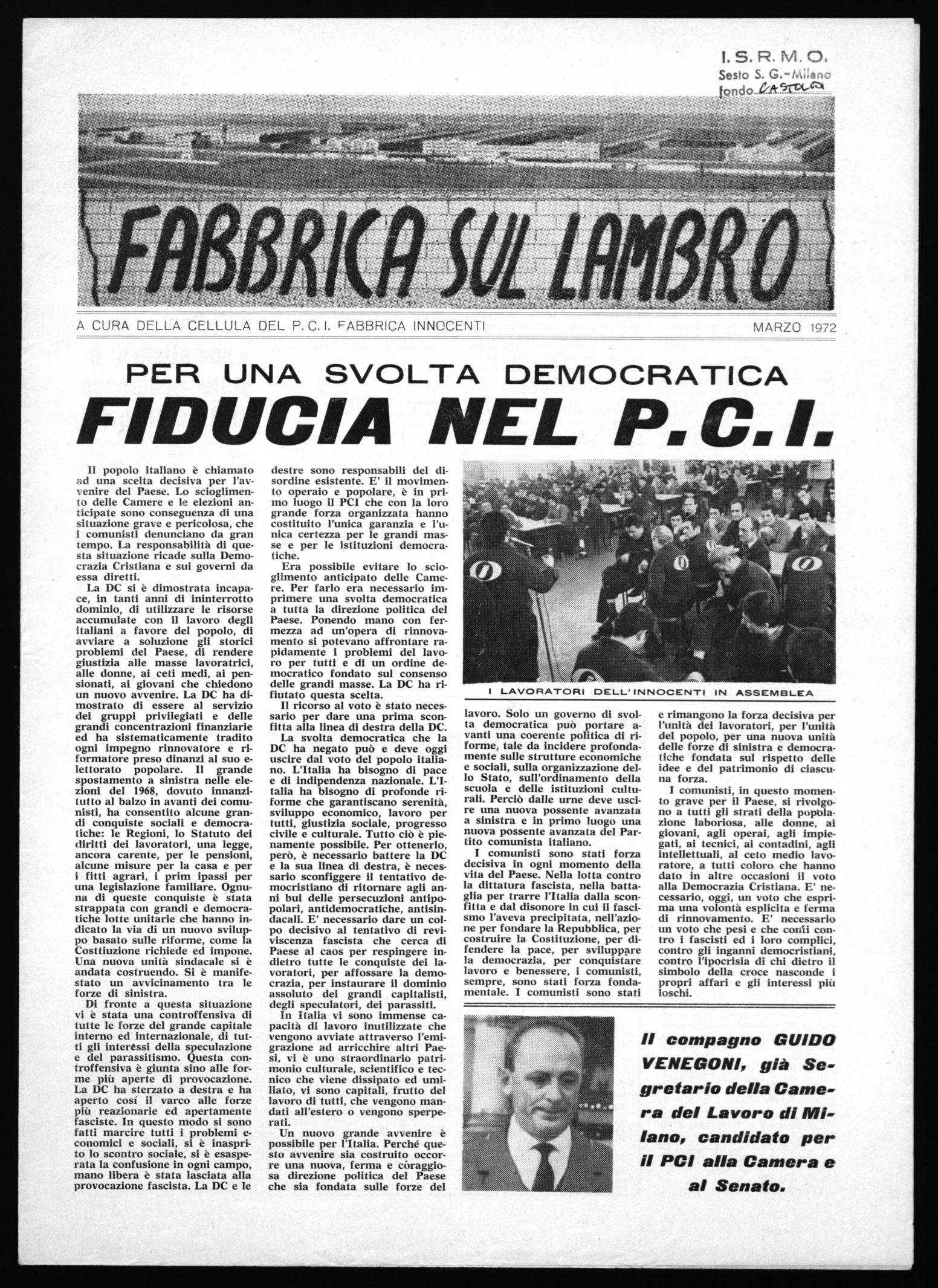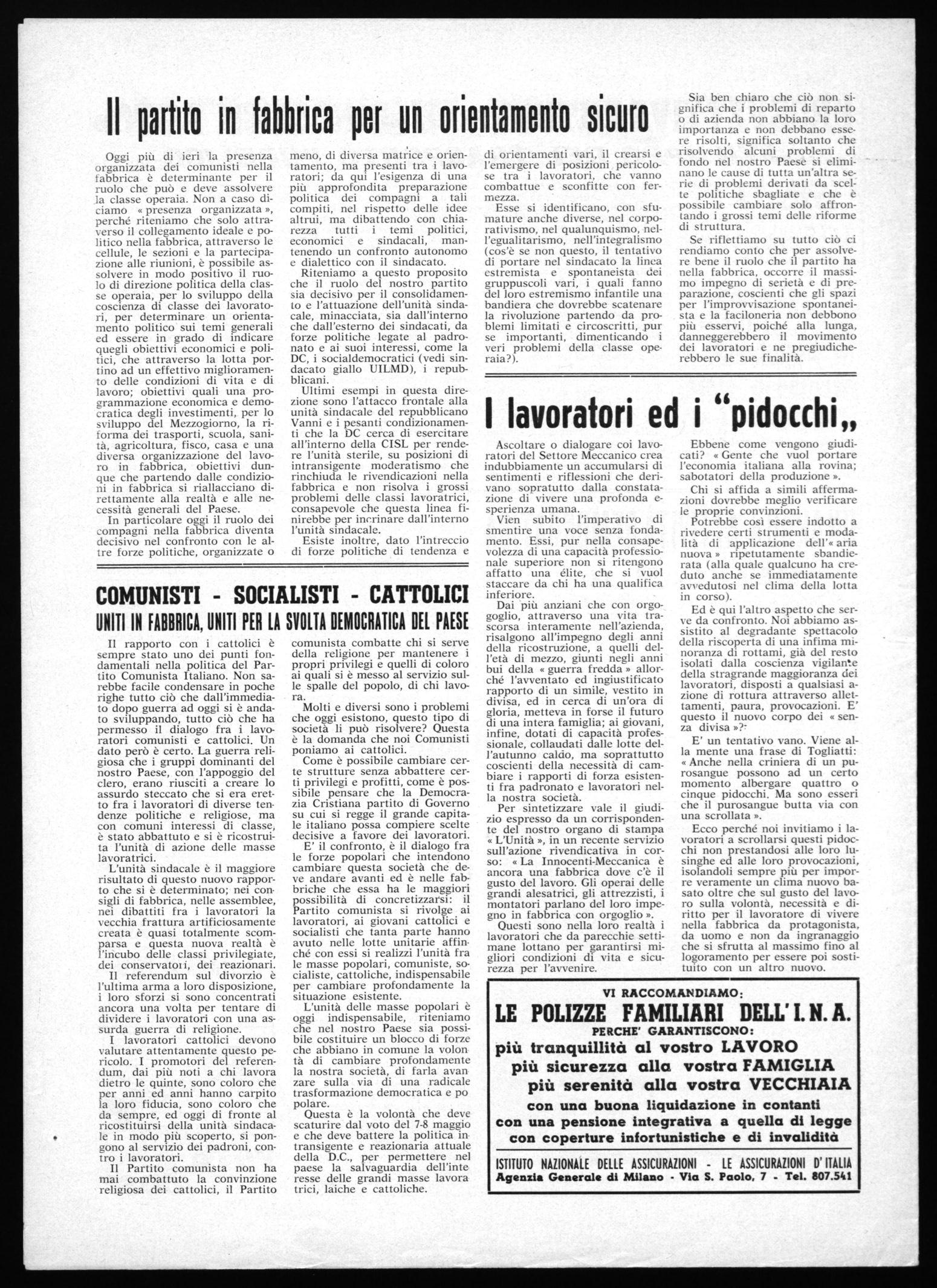 E' il confronto, è il dialogo fra le forze popolari che intendono cambiare questa società che deve andare avanti ed è nelle fabbriche che essa ha le maggiori possibilità di concretizzarsi: il Partito comunista si rivolge ai lavoratori, ai giovani cattolici e socialisti che tanta parte hanno avuto nelle lotte unitarie affinché con essi si realizzi l'unità fra le masse popolari, comuniste, socialiste, cattoliche, indispensabile per cambiare profondamente la situazione esistente.