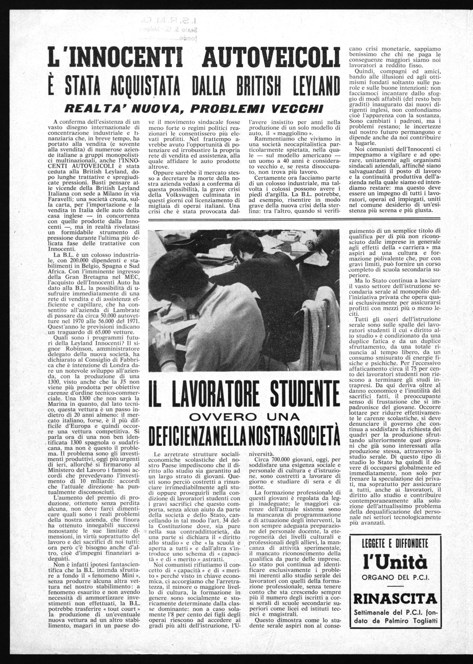 Quali sono i programmi futuri della Leyland Innocenti? Il signor Robinson, amministratore delegato della nuova società, ha dichiarato al Consiglio di Fabbrica che è intenzione di Londra dare un notevole sviluppo all'azienda, con la produzione di una 1300, visto anche che la J5 non viene più prodotta per obiettive carenze d'ordine tecnico-commerciale. Una 1300 che non sarà la Marina in quanto, dal lato tecnico, questa vettura è un passo indietro di 20 anni almeno: il mercato italiano, forse, è il più difficile d'Europa e quindi occorre una vettura competitiva. Si parla ora di una non ben identificata 1300 spagnola o sudafricana, ma non è questo il problema. Il problema sono gli investimenti produttivi, oggi più urgenti di ieri, allorché si firmarono al Ministero del Lavoro i famosi accordi che prevedevano l'investimento di 10 miliardi: accordi che l'attuale direzione ha puntualmente disconosciuti.
