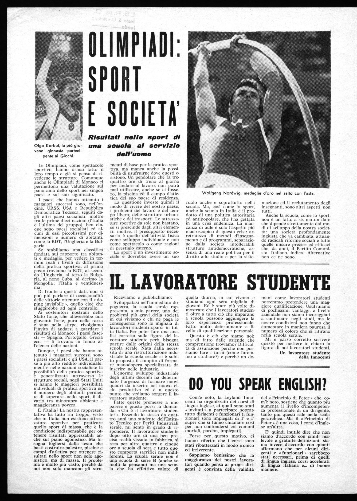 ruolo anche e soprattutto nella scuola. Ma, così come lo sport, anche la scuola in Italia è il prodotto di una politica autoritaria ed antipopolare, che l'ha gettata in una crisi endemica. La mancanza di aule è solo l'aspetto più macroscopico di questa crisi: arretratezza di metodi d'insegnamento e di programmi, separazione dalla società, intollerabili strutture antidemocratiche, assenza di una reale politica per il diritto allo studio e per la sistequella diurna, in cui vivono e studiano ogni sera migliaia di giovani. Ed è stato più volte dimostrato che i lavoratori studenti oltre a tutto ciò che imparano a scuola possono aggiungere la loro esperienza professionale. Fatto molto determinante a livello di qualificazione personale.