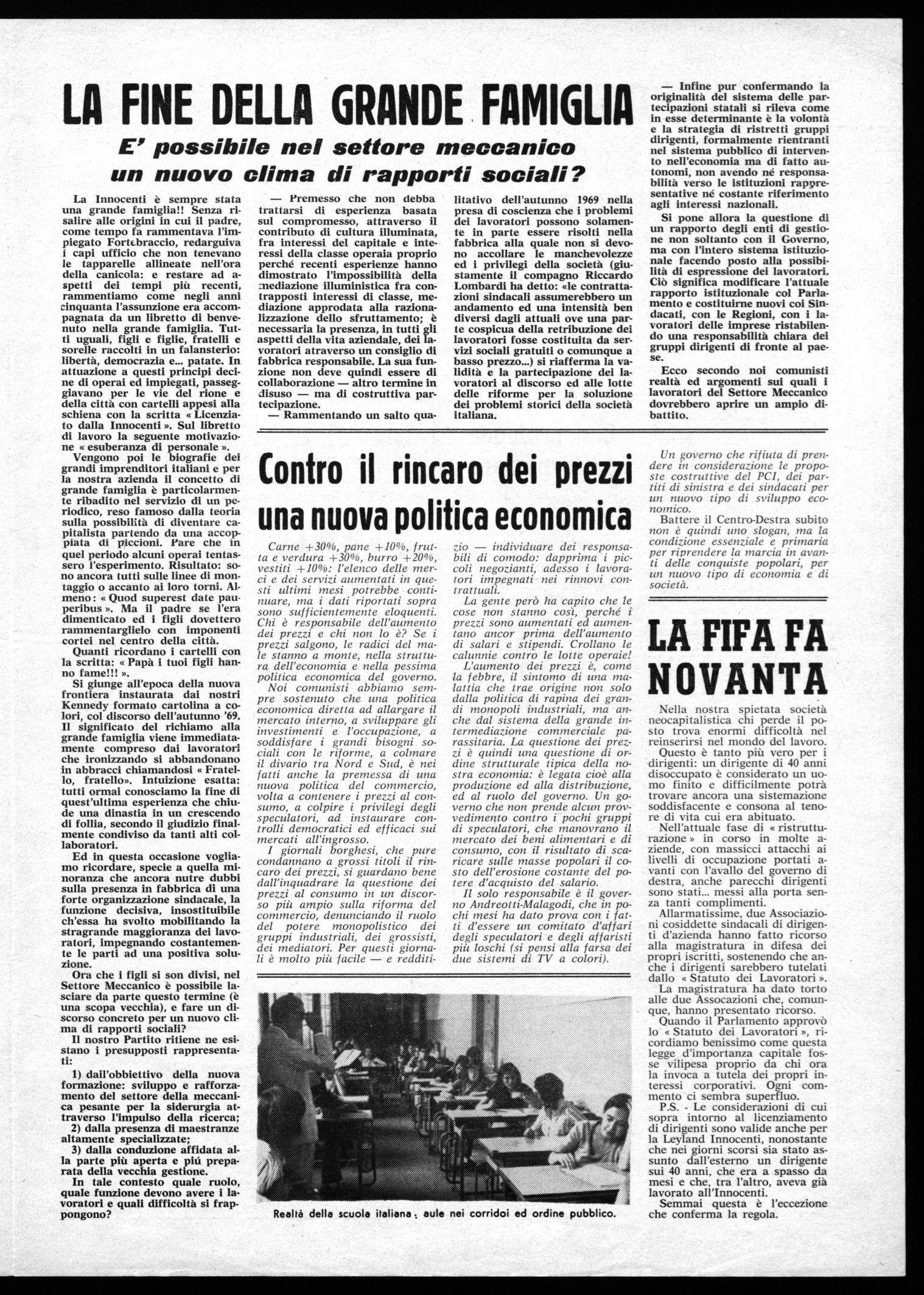 L'aumento dei prezzi è, come la febbre, il sintomo di una malattia che trae origine non solo dalla politica di rapina dei grandi monopoli industriali, ma anche dal sistema della grande intermediazione commerciale parassitaria. La questione dei prezzi è quindi una questione di ordine strutturale tipica della nostra economia: è legata cioè alla produzione ed alla distribuzione, ed al ruolo del governo. Un governo che non prende alcun provvedimento contro i pochi gruppi di speculatori, che manovrano il mercato dei beni alimentari e di consumo, con il risultato di scaricare sulle masse popolari il costo dell'erosione costante del potere d'acquisto del salario.