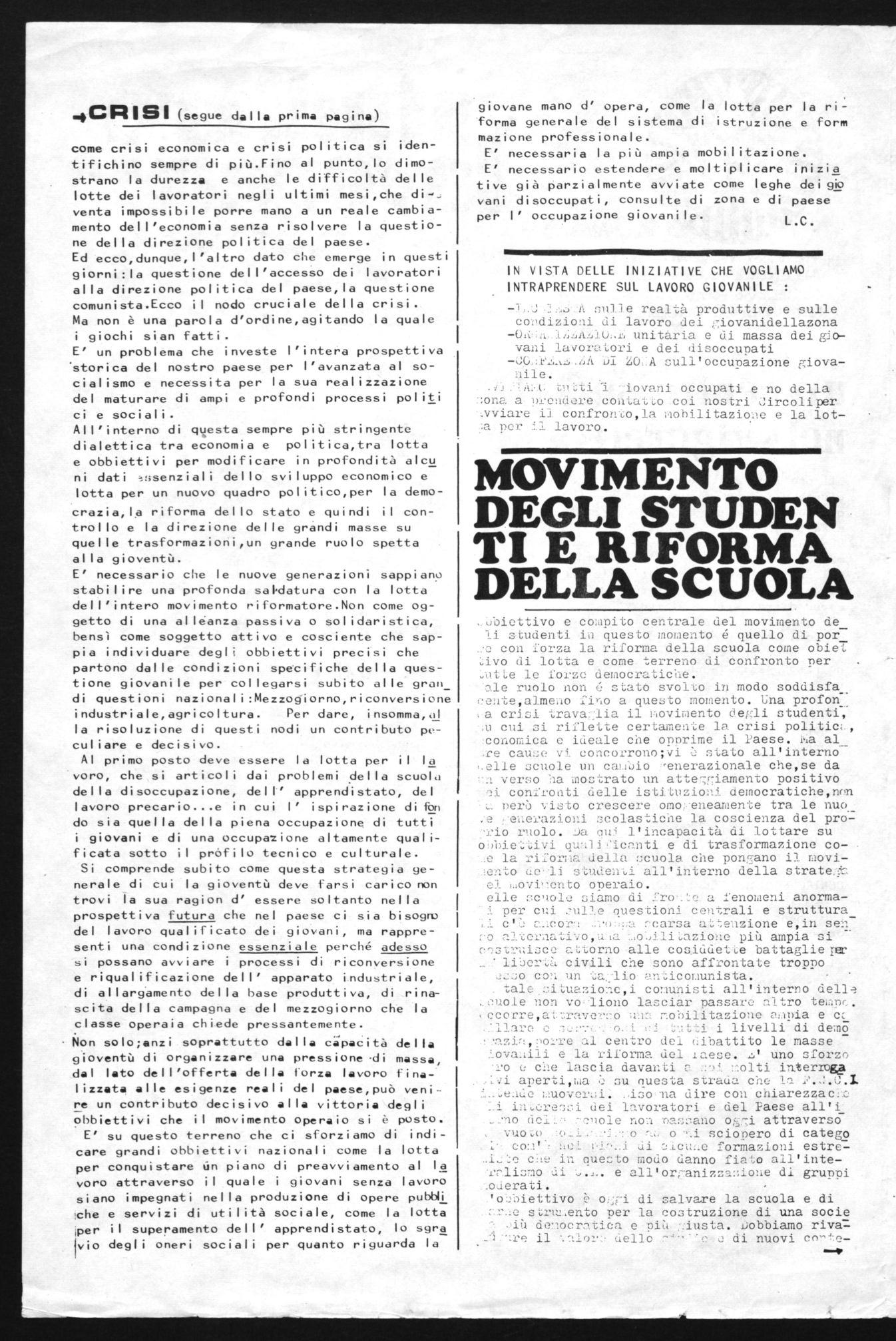-cbiettivo e compito centrale del movimento de li studenti in questo momento é quello di por con forza la riforma della scuola come obiet Avo di lotta e come terreno di confronto per ;,atte le forze democratiche. a.le ruolo non é stato svolto in modo soddisfa cente,alme;io lino a questo momento. Una profon a crisi travalia il movimento degli studenti, a,1 cui si riflette certamente la crisi politici., conomica e ideale che opprime il Paese. al_ ,re cause vi concorrono;vi ù stato all'interno alle scuole un cambio generazionale che, se da r._i verso ha mostrato un atte:;giamento positivo oi confronti delle istituzioni democratiche,non però visto crescere omo»eneamente tra le nue). _ ;e enerazioni scolastiche la coscienza del pro-rio ruolo. Ja ou5 l'incapacità di lottare su oJbiettivi qunliienmti e di trasformazione coe riforma della scuola che pongano il moviento de li studenti' all'interno della strate; ci i.iovi!:!cnto operaio. elle scuole siamo di .rc) c a fenomeni anormai per cui .culle questioni centrali e struttura c...corr! ;.()::;;a rcarsa atenzione e,in se_ alternativo,una 1.pbiliazione più ampia si cestruisce attorno alle cosiddette battaglie re' ' libertà civili che sono affrontate troppo • • 2J.30 coi un tajlio. anticomunista. . talepituazione,i comunisti all'interno delle suole non vo liono lasciar passare altro tempc, ccerre,at-Jraver(p uu: mobilitazione ampia e cc Ilare e •utti i livelli di demo sazia, al centro del dibattito le masse - ri !ovaniii e la riforma del iaese. 2 1 uno sforzo ro e che lascia davanti assolti in.terrogè ti aperti,ma ò su nuesta strada che la ..tende LnioverGi. -ido-ma dire con chiarezzac,p ..i interessi dei lavoratori e del Paese all'i io dei!. non Passano ori attraverso vuo io o -.i sciopero di catego com'', nei di 1:icize. formazioni estrocite in questo modo danno fiato all'iuterrlismo di b.n. e all'or;unizza:sione di gruppi pderati. ,obiettivo è ci,;fi di salvare la scuola e di e strumento per la costruzione di una socie iù democratica e più ::iusta. bobbiamo riva= _1 nre il dello 7' 'oc di nuovi cc e-