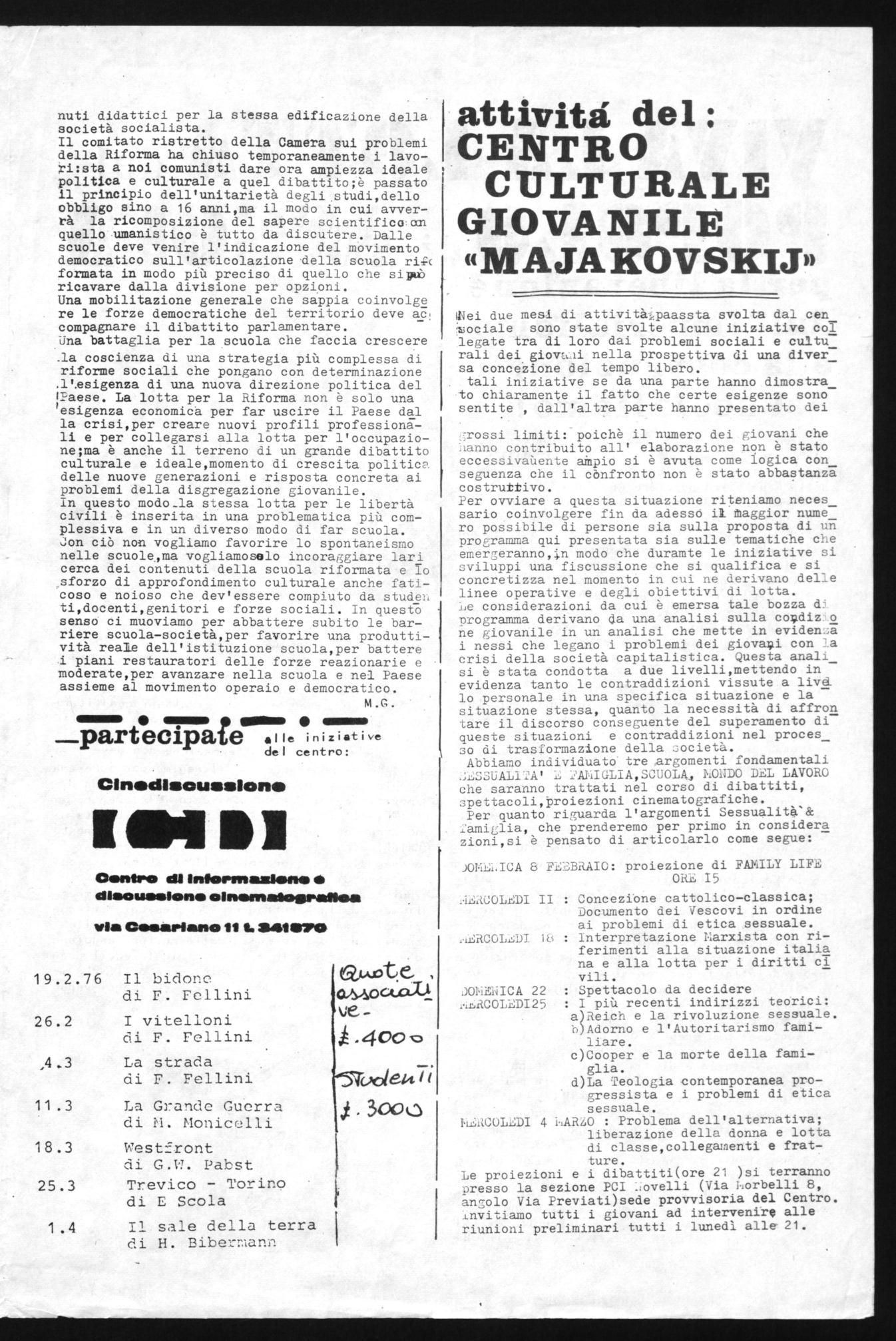 Le proiezioni e i dibattiti(ore 21 )si terranno presso la sezione PCI (Via Lorbelli 8, angolo Via Previati)sede provvisoria del Centro. invitiamo tutti i giovani ad intervenire alle riunioni preliminari tutti i lunedì alle 21.