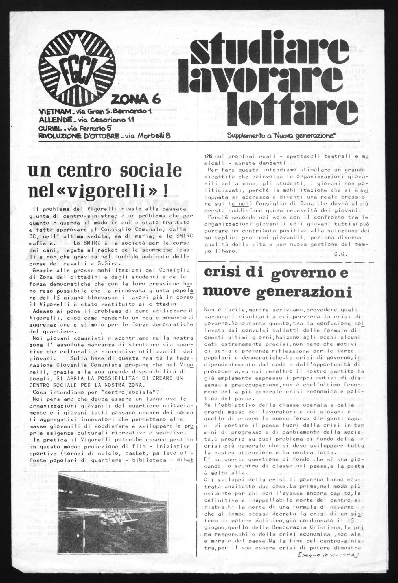 Noi giovani comunisti riscontriamo nella nostra zona I' assoluta mancanza di strutture sia sportive che culturali e ricreative utilizzabili dai giovani. Sulla base di questa realtà la Federazione Giovanile Comunista propone che nel Vigo relli, grazie alla sua grande disponibilità di locali, SI ABBIA LA POSSIBILITA' DI CREARE UN CENTRO SOCIALE PER LA NOSTRA ZONA.