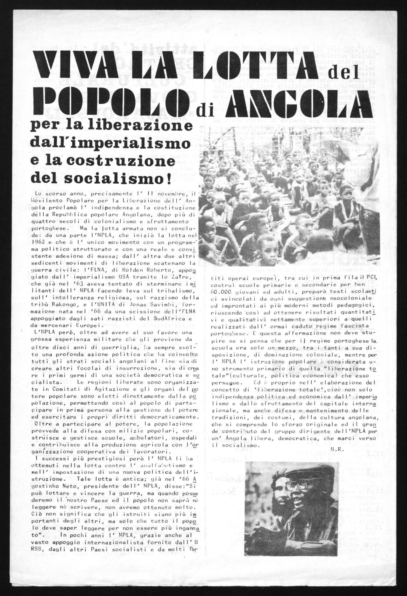 Lo scorso anno, precisamente I' Il novemhre, il Hovilento Popolare per la Liberazione dell' Angola proclamò I' indipendenza e la costituzione della Repubblica popolare Angolana, dopo più di quattro secoli di colonialismo e sfruttamento portoghese. Ma la fotta armata non si conclude: da una parte I'MPLA, che iniziò la lotta nel 1962 e che è I' unico movimento con un program-. ma politico strutturato e con una reale e consi stente adesione di massa; dall' altra due altri sedicenti movimenti di liberazione scatenano la guerra civile: l'FLNA, di Holden Roberto, appog giato dall' imperialismo USA tramite lo ZaTre, che già nel '63 aveva tentato dí sterminare imi litanti dell' MPLA facendo leva sul tribalismo, sull' intolleranza religiosa, sul razzismo della tribù Bakongo, e l'UNITA di Jonas Savimhi, formazione nata nel '66 da una scissione dell'FLNA appoggiato dagli sati razzisti del SudAfrica e da mercenari Europei.