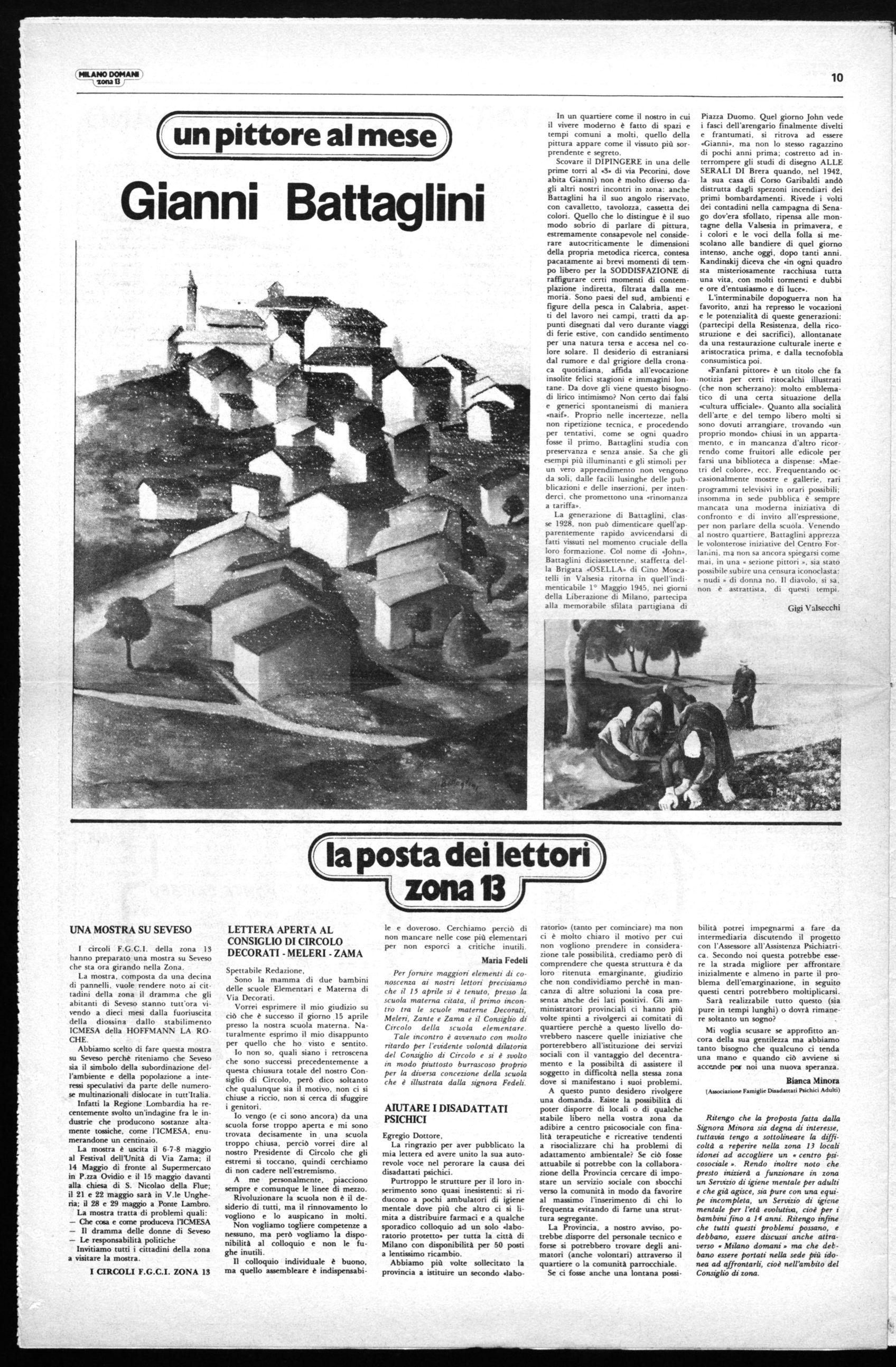 Piazza Duomo. Quel giorno John vede i fasci dell'arengario finalmente divelti frantumati, si ritrova ad essere «Gianni», ma non lo stesso ragazzino di pochi anni prima; costretto ad interrompere gli studi di disegno ALLE SERALI DI Brera quando, nel 1942, la sua casa di Corso Garibaldi andò distrutta dagli spezzoni incendiari dei primi bombardamenti. Rivede i volti dei contadini nella campagna di Senago dov'era sfollato, ripensa alle montagne della Valsesia in primavera, e i colori e le voci della folla si mescolano alle bandiere di quel giorno intenso, anche oggi, dopo tanti anni. Kandinskij diceva che «in ogni quadro sta misteriosamente racchiusa tutta una vita, con molti tormenti e dubbi e ore d'entusiasmo e di luce». L'interminabile dopoguerra non ha favorito, anzi ha represso le vocazioni le potenzialità di queste generazioni: (partecipi della Resistenza, della ricostruzione e dei sacrifici), allontanate da una restaurazione culturale inerte e aristocratica prima, e dalla tecnofobìa consumistica poi. «Fanfani pittore» è un titolo che fa notizia per certi ritocalchi illustrati (che non scherzano): molto emblematico di una certa situazione della «cultura ufficiale». Quanto alla socialità dell'arte e del tempo libero molti si sono dovuti arrangiare, trovando «un proprio mondo» chiusi in un appartamento, e in mancanza d'altro ricorrendo come fruitori alle edicole per farsi una biblioteca a dispense: «Maetri del colore», ecc. Frequentando occasionalmente mostre e gallerie, rari programmi televisivi in orari possibili; insomma in sede pubblica è sempre mancata una moderna iniziativa di confronto e di invito all'espressione, per non parlare della scuola. Venendo al nostro quartiere, Battaglini apprezza le volonterose iniziative del Centro Forlanini. ma non sa ancora spiegarsi come mai. in una « sezione pittori », sia stato possibile subire una censura iconoclasta: « nudi » di donna no. Il diavolo, si sa, non è astrattista, di questi tempi.