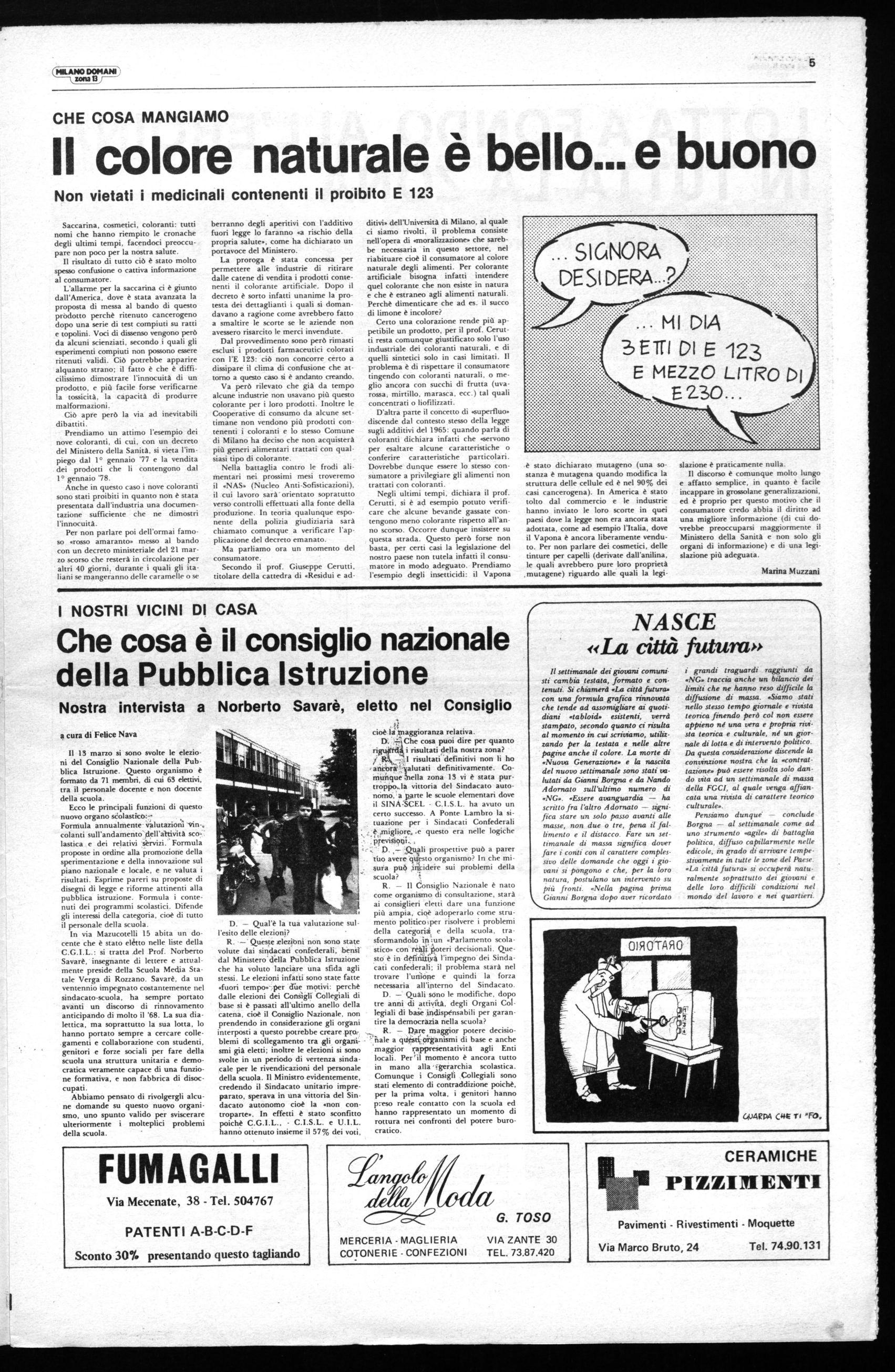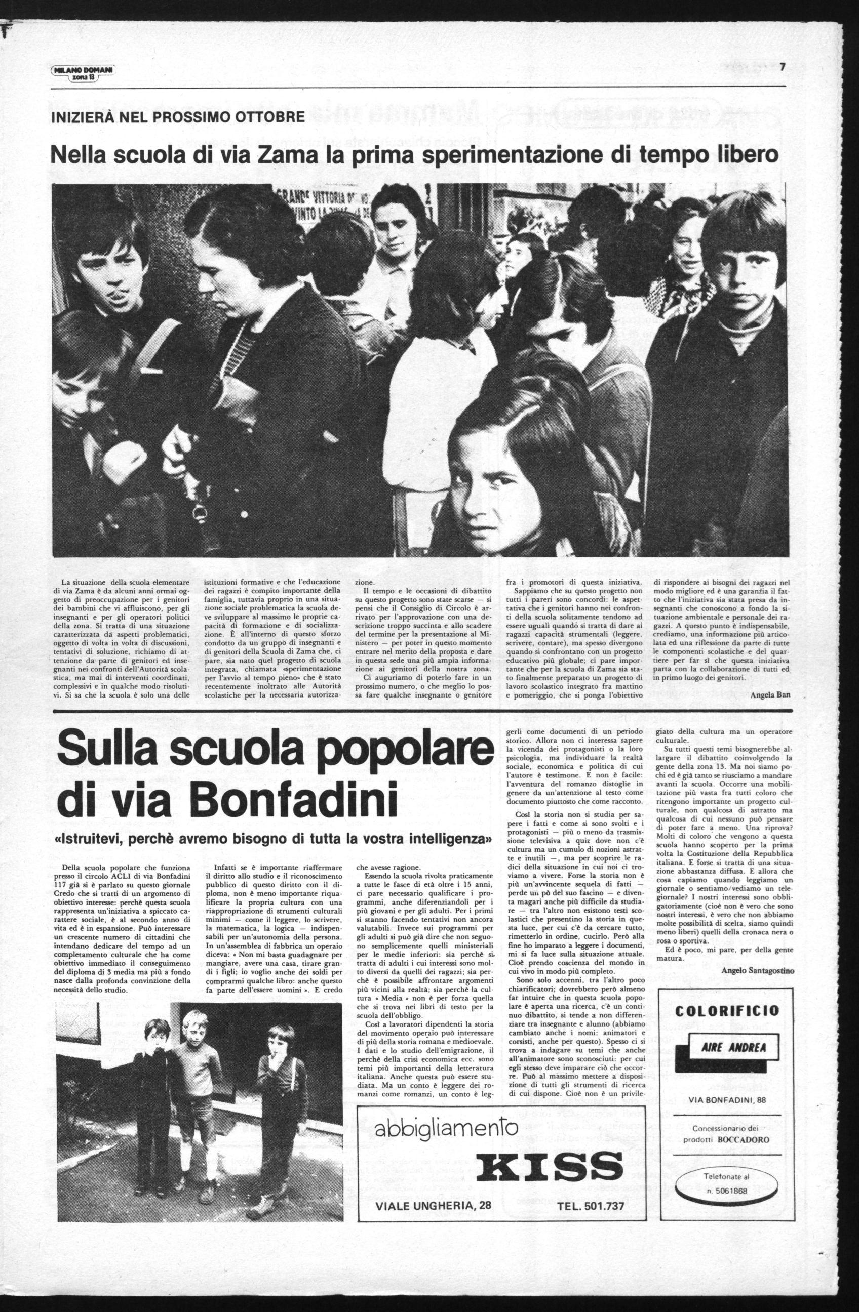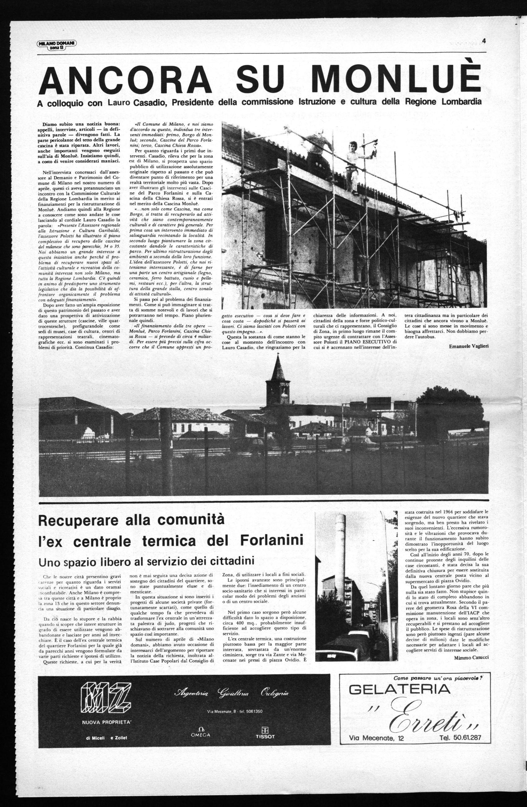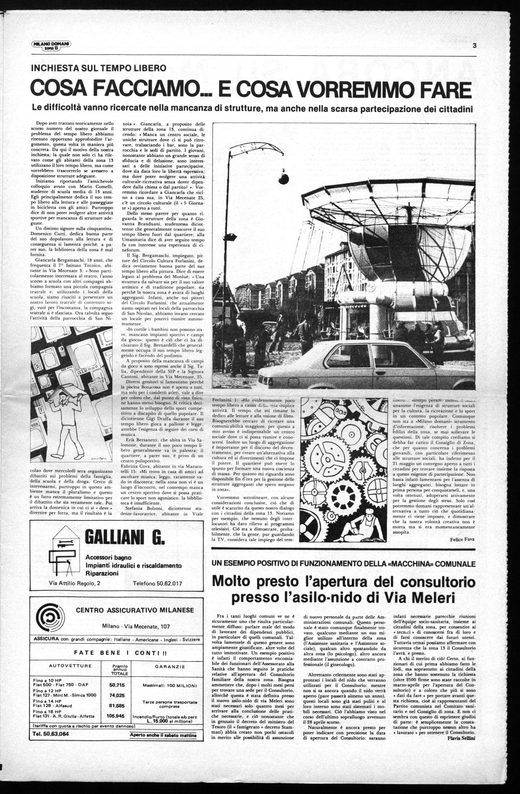 Vogliamo, per concludere, fare solo alcuni esempi di « campagne di stampa » su cui « Milano domani » si è impegnato negli ultimi mesi. Il dibattito sul Consultorio al quale abbiamo invitato tutti a prendere parte e, nella prospettiva della sua apertura, intorno alla cui gestione molti giovani — e non solo ragazze — pensiamo debbano essere interessati. La « campagna » per il recupero di Monluè vecchio che con soddisfazione possiamo dire abbia avuto dei primi risultati positivi: il pericolo di crollo è stato allontanato grazie alle pronte riparazioni che sono state fatte dalla Amministrazione comunale ed il programma di rinascita del borgo di Monluè è ritornato concretamente in primo piano. La lotta alla droga e agli spacciatori che più numerosi e minacciosi sono diventati nella nostra zona. Non si tratta solo di sollecitare l'intervento della polizia perchè controlli i luoghi dove lo spaccio avviene (luoghi del resto che sono ben noti), ma di far crescere nei cittadini, e soprattutto nei giovani che ne sono le principali vittime, la coscienza che solo attraverso un'azione di massa si può battere questa pericolosa piaga sociale. Una lotta a fondo rivolta in questa direzione, coordinata dalle forze politiche e sociali operanti nel Consiglio di zona, deve pertanto partire già da questa á Conferenza di zona sui problemi giovanili ».