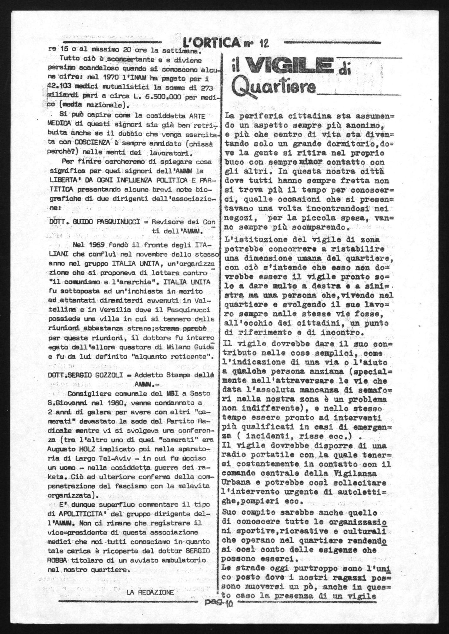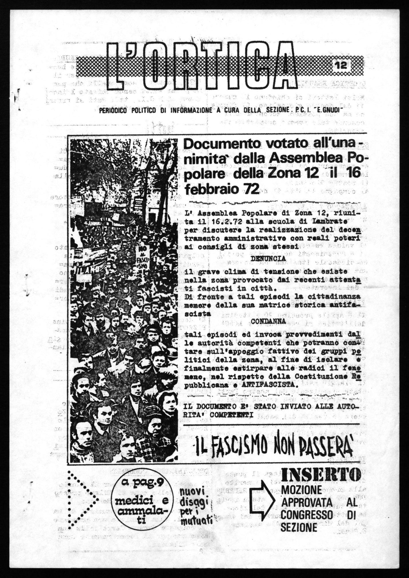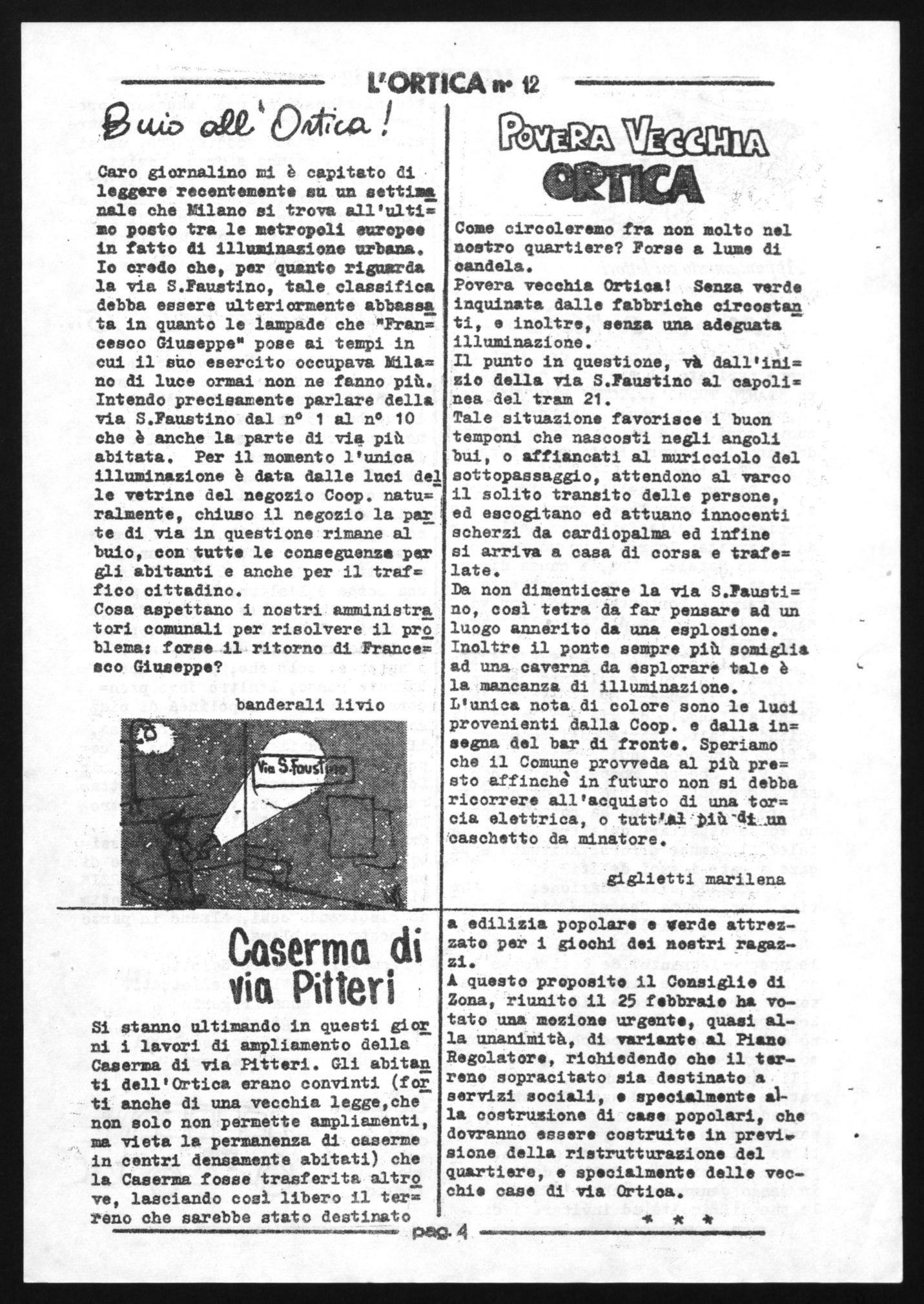 A questo proposito il Consiglio di Zona, riunito il 25 febbraio ha votato una mozione urgente, quasi alla unanimità, di variante al Piano Regolatore, richiedendo che il terreno sopracitato sia destinato a servizi sociali, • specialmente costruzione di case popolari, che dovranno essere costruite in previe. alone della ristrutturazione del quartiere, e specialmente delle vecchie case di via Ortica.