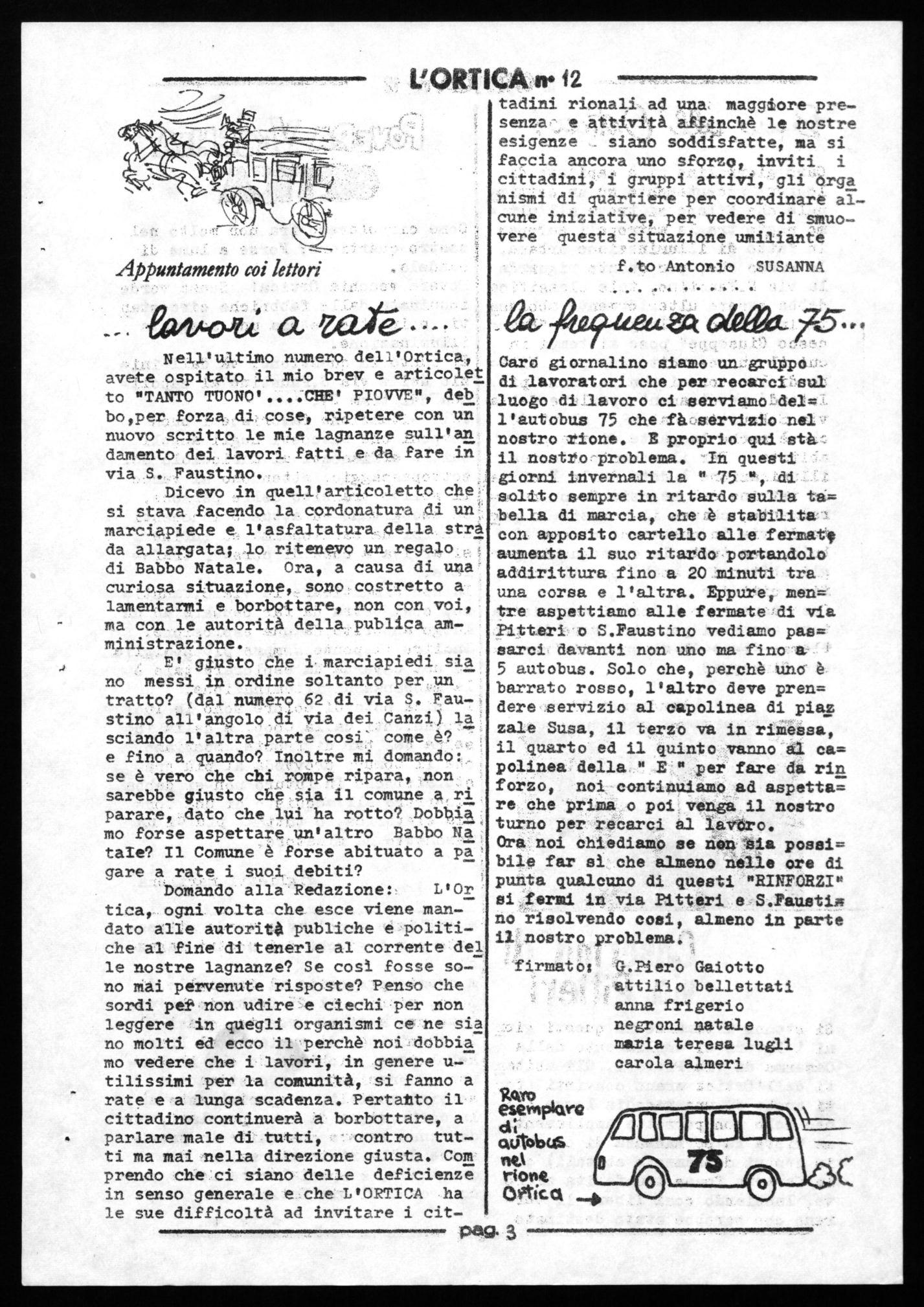 Card giornalino siamo un.JgrUPpéd-,di lavoratori che per 'recarci ;:',Esul luogo Ali „lavoro ci •• aervi amo dei= l'i l'autobus 75 che fla.Qaervizio nel nostro rione. E proprio qui,'stia,/,.: il nostro 2-probl ema queeitt giorni invernali la "..75 solito sempre in ritardo sulla ts= bella di marcia, che .;:è stabilita' con apposito cartello 'alle. fermati, aumenta il suo ritardo portandolo addirittura fino a 20.:minuti tra una corsa e l'altra. Eppure,. mene' tre aspettiamo alle fermate Ali via Idtteri o S.Paustino vediamo pas= sarei davanti non uno ma fino a 5 autobus. Solo che, perchè uno è barrato rosso, l'altro deve pren= dere servizio al capolinea di pian sale Susa, il terzo va in rimessa, il quarto ed il quinto vanno &l ca= polinea, " E'" per fare da rin forzo, noi continuiamo ad aspetta= re che prima o poi vanga il nostro turno per recarci al la o. Ora noi chiediamo se nenAla posai-bile far sì che almeno nelle ore di punta qualcuno di questi "RlirgORZI" si;termi in via Pittori e S.PaustiA no risolvendo covi, almeno in parte il,' nostro problema.., firmat ''.Piero Gai ott o pmAtilio bellettati enne frigerio negroni natale maria tereaa lugli carola alacri esemplare