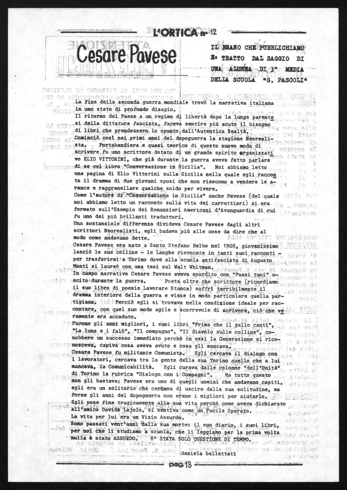Il ritorno del. paese,a,-int,regiate. 4 libertà dopo laAgikga.-'earerite.,_j_1,.. g. .della dittatura „fascifita,,,Eace4 sentirepi acuto il bisognodi libri che .Fendeaser4; 1o. S4u, Cominciò così nel. primi an*i :de.i,:depoguerra la stagione — --sta Portabandiera.:,e -quasi::teorico di questo nuovo moacp. di scrigere„fu.,Uno...scrittore dotato di un grande spirito organizzati In, ELIO VITTÓRINI, che già durante la guerra aveva fatto parlíre 4 . • • dii.se-,...e0.1..-.1ibre;"Conversazione.in Sicilia". Noi abbiamo., letto una pagina di Elio Vittorirti sulla Sicilia nella quale egli racco! ta il dramma di due giovani sposi che non riescono a vlsendeitalé,..1,7....• rance e raggranellare qualche soldo per vivere. Come l'autore dir'..i;"0ive'r* . ael.4.01ie in Sicilia" anche Pavese (del quale noi abbiamo letto un racconto sulla vita dei_carretti.eri) ai. era. formato sull'Esempio dei Romanzieri Antericakid.'Avanguardits di. cui fu uno dei più brillanti traduttori. ,••••• Una sostanziale differenza divideva Cesare Pavese dagli altri scrittori Neorealisti, . egli badava ;più alle cose da dire che al modo come andavano dette, •