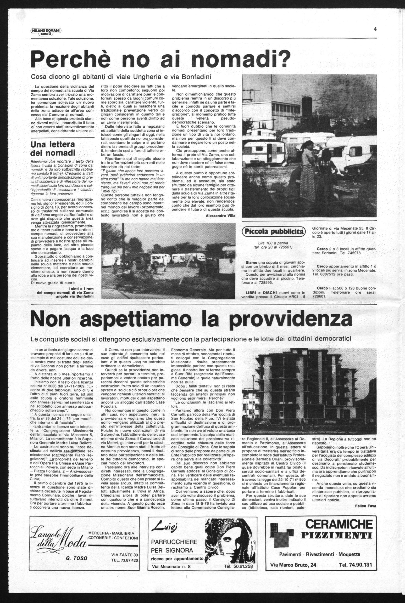 Ma tutto questo ha un prezzo: il rischio di stare a margine dei problemi privilegiandone l'aspetto scandalistico e folcloristico. È una scelta. Certo non è agevole presentare ai propri lettori problemi complessi come quelli di Ponte Lambro, se non ci si addentra in quella che è storia viva del quartiere e che è fatta di iniziative, di lotte, di battaglie e di obiettivi che il Consiglio di zona, assieme ai cittadini del quartiere, va sviluppando da lunghi anni.