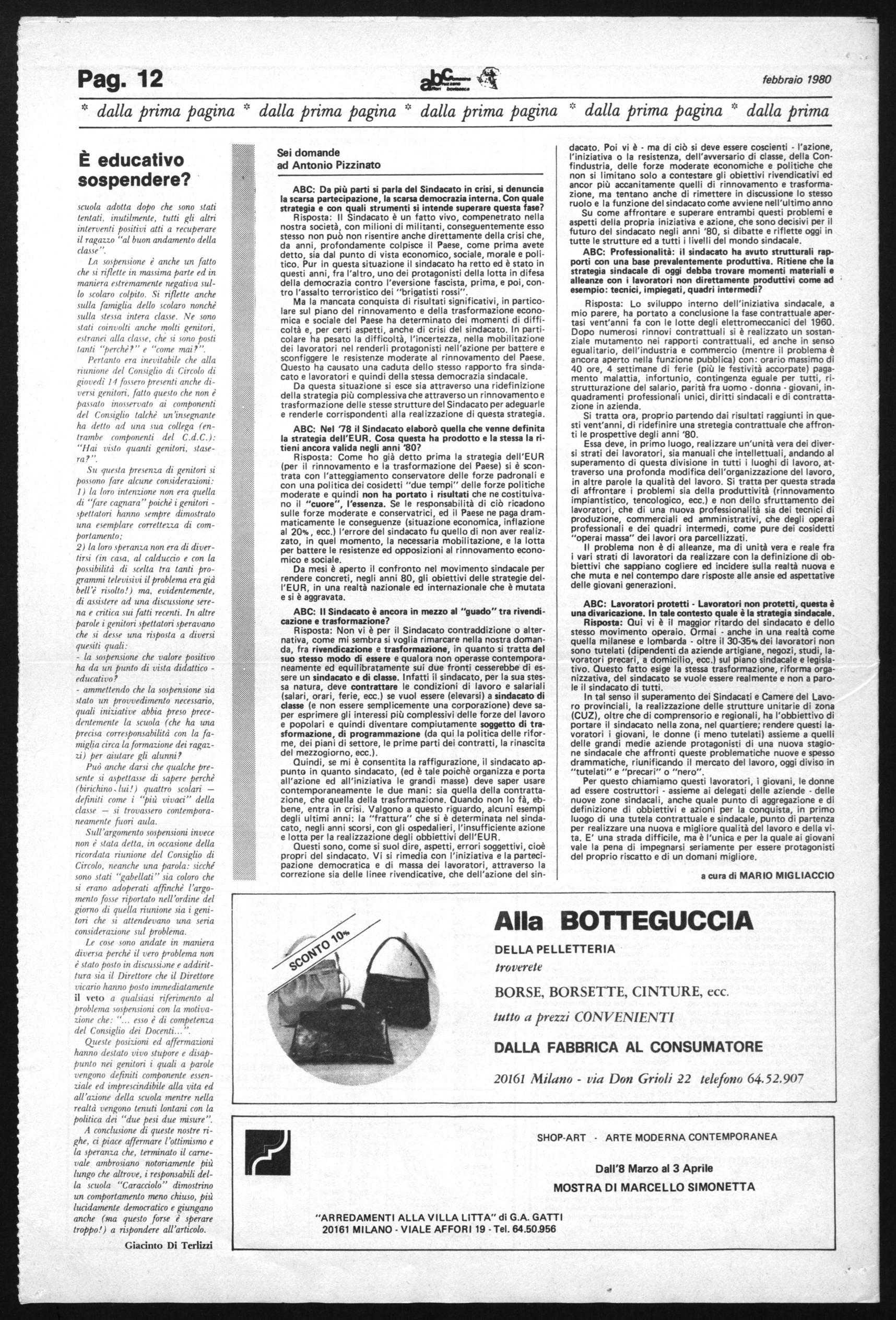 - Giovedi 28 feb. 80 - ore 15 - Assemblea anziani zona 8 - per fare un consuntivo di questa iniziativa e per proporre e studiare altri programmi. Salone di Villa Litta. Ciclo di concerti di musica classica (in collaborazione con il C.d.Z. 8 e il Centro Studi 80)
