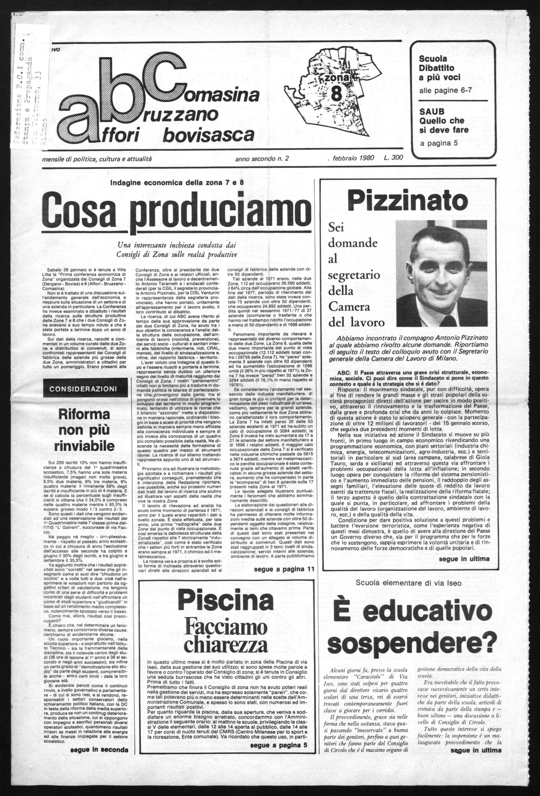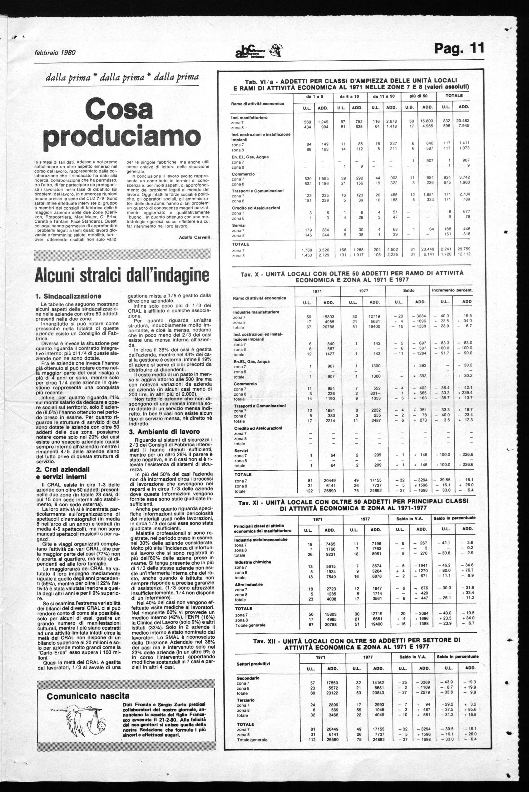 Conferenza, oltre al presidente dei due Consigli di Zona e ai relatori ufficiali, anche l'Assessore al lavoro e decentramento Antonio Taramelli e i sindacati confederali (per la CGIL il segretario provinciale Antonio Pizzinato, per la CISL Venturini in rappresentanza della segreteria provinciale), che hanno portato, unitamente all'apprezzamento per il lavoro svolto, il loro contributo al dibattito. La ricerca, di cui ABC aveva riferito al tempo della sua approvazione da parte dei due Consigli di Zona, ha avuto tra i suo obiettivi la conoscenza e l'analisi della struttura della occupazione, dell'ambiente di lavoro (nocività, prevenzione), dei servizi socio - culturali e sanitari interni alle fabbriche (infermerie, nidi, CRAL, mense), del livello di sindacalizzazione e, infine, del rapporto fabbrica - territorio. L'aver voluto una indagine di questo tipo e l'essere riusciti a portarla a termine, rappresenta senza dubbio un ulteriore segno del livello di maturità raggiunto dai Consigli di Zona. I nostri "parlamentini" infatti non si limitano più a tradurre in domanda politica le istanze di partecipazione che provengono dalla gente, ma si pongono ormai nell'ottica di governare lo sviluppo del territorio In modo programmato, tentando di utilizzare le rsorse che il bilancio "azzonato" mette a disposizione in maniera razionale, ordinando i bisogni in base a scale di priorità che vengano definite in maniera sempre meno affidate alla conoscenza individuale e sempre di più invece alla conoscenza di un quadro più completo possibile della realtà. Ne discende la necessità della formazione di questo quadro per mezzo di strumenti idonei. La ricerca di cui stiamo trattando rappresenta appunto uno di tali strumenti. Proviamo ora ad illustrare la metodologia adottata e a richiamare i risultati più significativi conseguiti, premettendo che è intenzione della Redazione riportare, ove possibile, anche sui prossimi numeri dati tratti dal lavoro di ricerca che aiutino ad illustrare vari aspetti della realtà che vive la nostra Zona. Il lavoro di rilevazione ed analisi ha avuto come momento di partenza il 1971, anno per il quale erano reperibili i dati a livello zonale. È stata effettuata, per tale anno, una prima "radiografia" delle due Zone dal punto di vista occupazionale. È così emersa la debolezza strutturale della Zona8 rispettoi alla 7 storicamente "industrializzata", cosi come è stato verificato che i settori più forti in entrambe le Zone erano sempre al 1971, il chimico ed il metalmeccanico. La ricerca vera e propria si è svolta sotto forma di inchiesta attraverso questionari diretti alle direzioni aziendali ed ai
